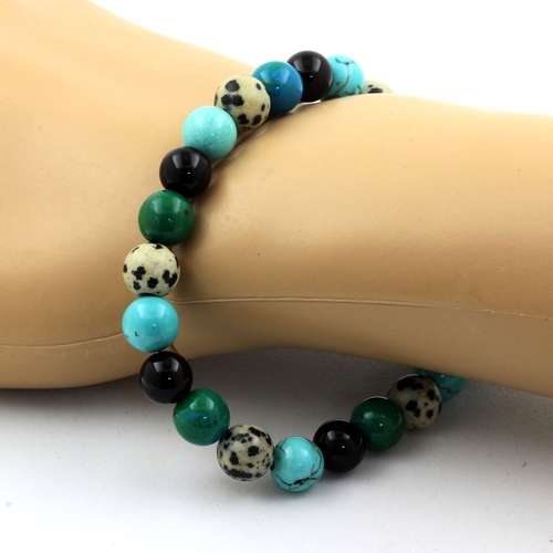 Dalmatian Jasper + Turquoise + Chrysocolla + Black Agate Bracelet 8 mm Beads. Length 19-20 cm. Comes in a box pouch. We can make it to your length on request. Made in France in our A Bijoux workshop.