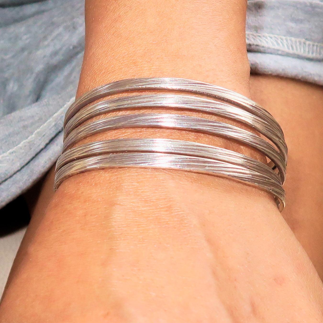 A beautifully handcrafted minimalistic 5 String Sterling Silver Bracelet showcasing its flexible design and hallmark 925.