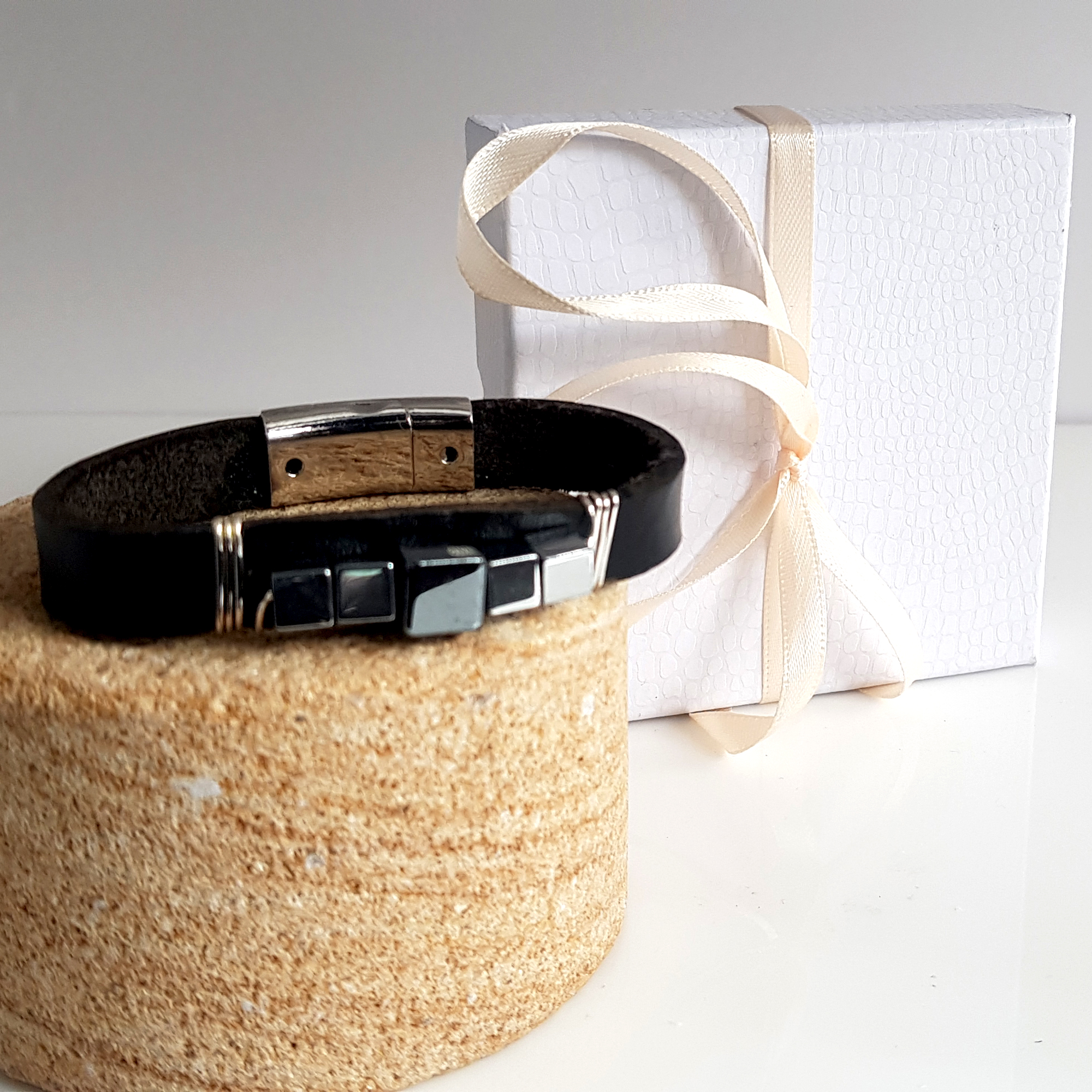 KTC-287 Unisex Bracelet featuring a black leather band, sterling silver wire wrapped Haematite square beads, and a silver-plated magnetic clasp.