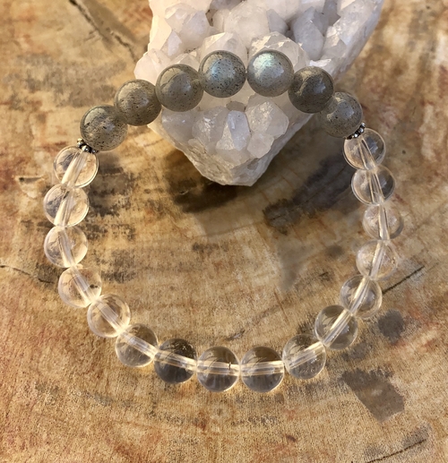 Blue Flash Labradorite & Brazilian Crystal Quartz Stretch Bracelet! This is an all natural bracelet handmade using only genuine gemstones and crystals.