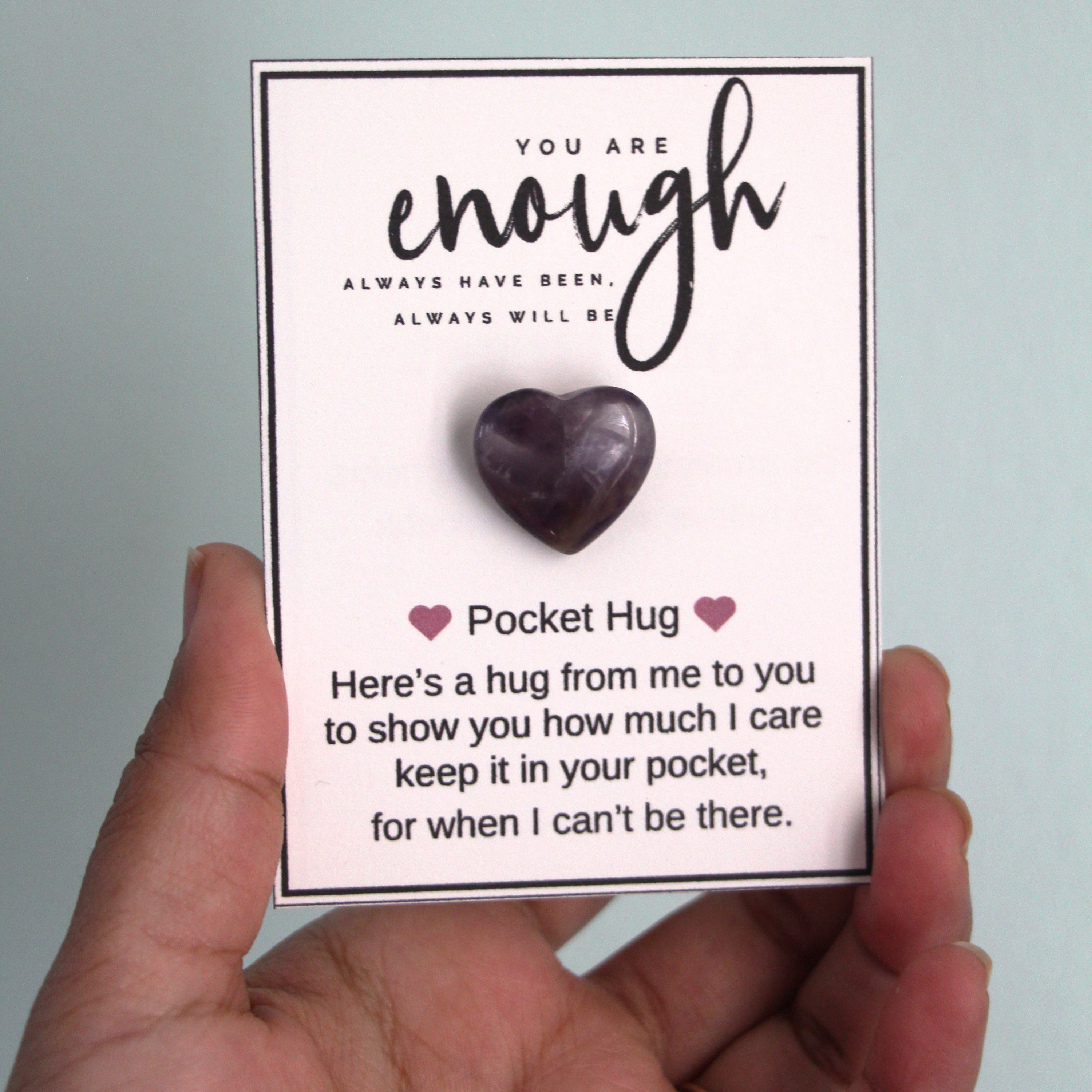 In summary, our Natural Gemstone Pocket Hugs - Amethyst are more than just beautiful gifts; they are tokens of love and support. With their stunning appearance, thoughtful packaging, and the positive energy of amethyst, these pocket hugs are sure to bring joy to anyone who receives them. Whether for yourself or a loved one, these pocket hugs are a delightful way to share warmth and positivity.