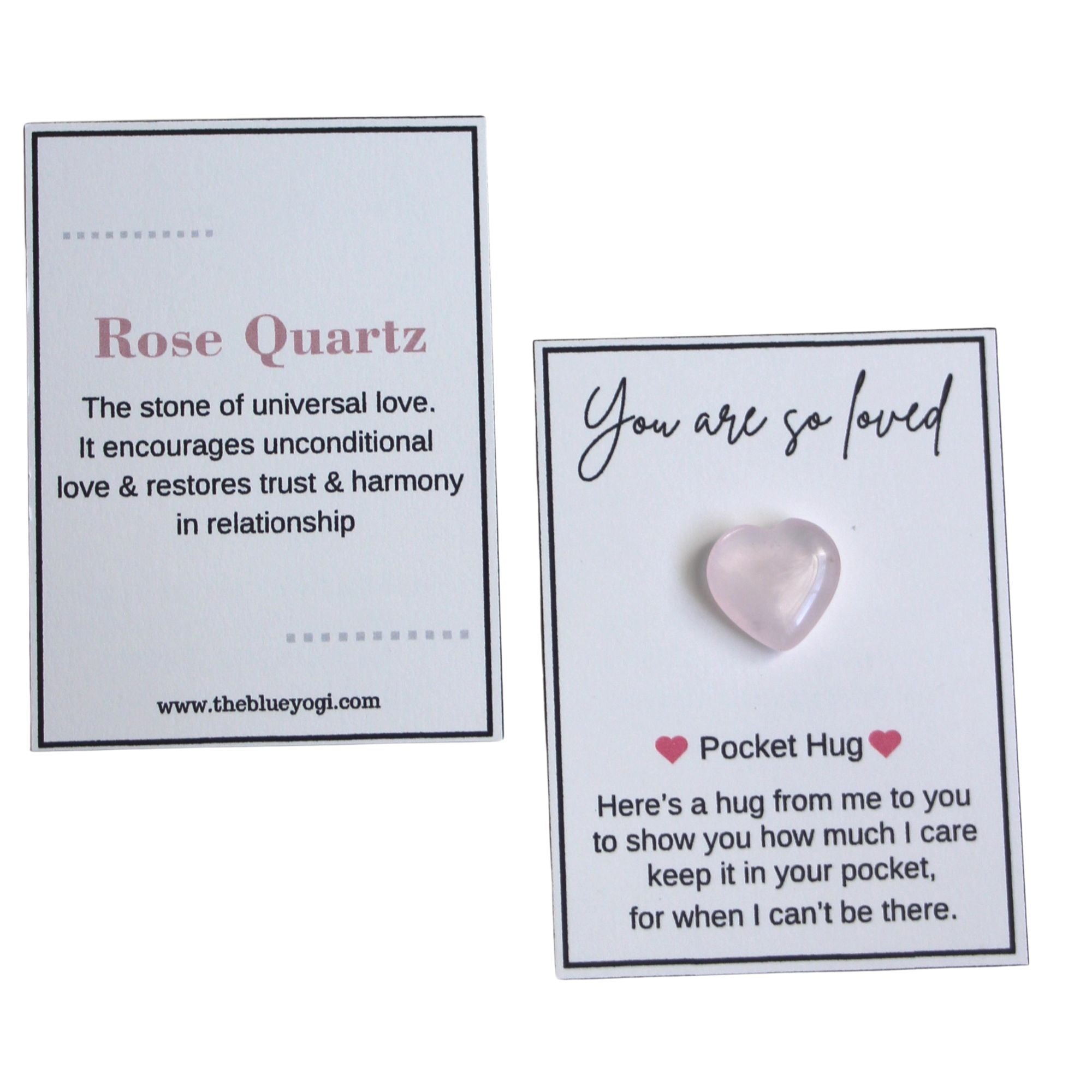 Each Natural Gemstone Pocket Hug comes beautifully packaged with a card that features a heartfelt gift message on the front. On the back of the card, you will find information about the properties of rose quartz, making it not just a gift, but also an educational experience. The card measures 2.75 x 3.75 inches, providing a lovely presentation that complements the crystal heart.