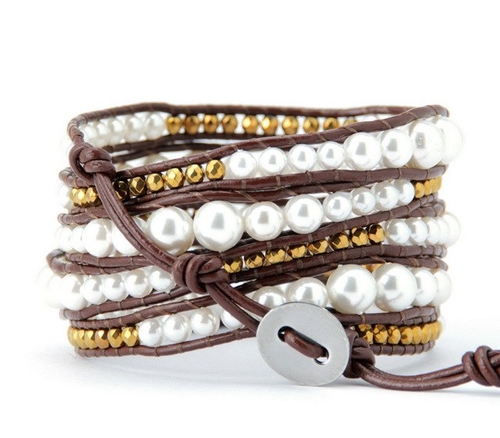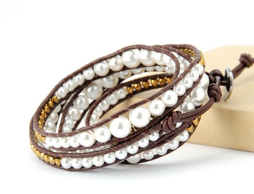 Dropship New Graduated Shell Pearls Leather Wrap Bracelet