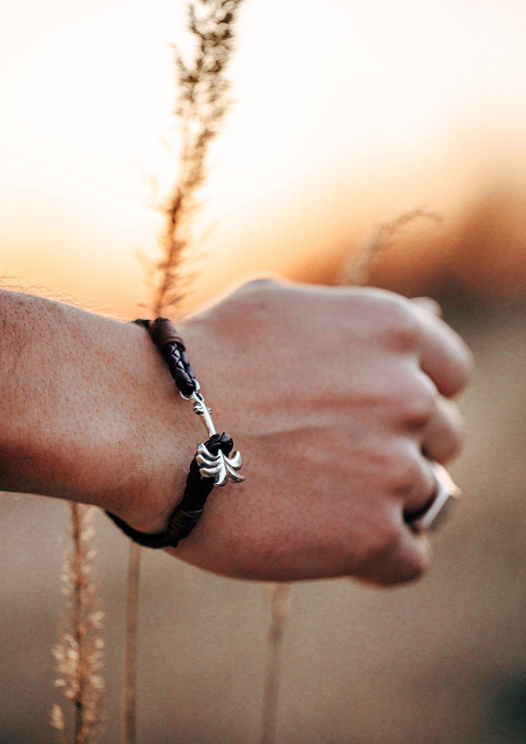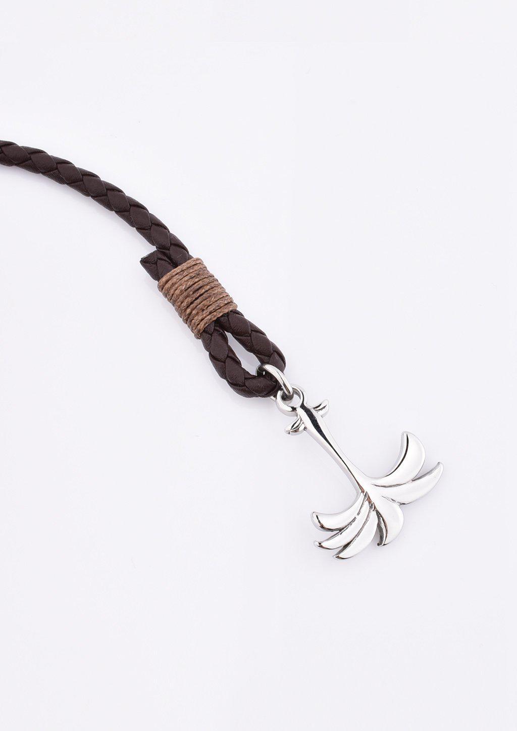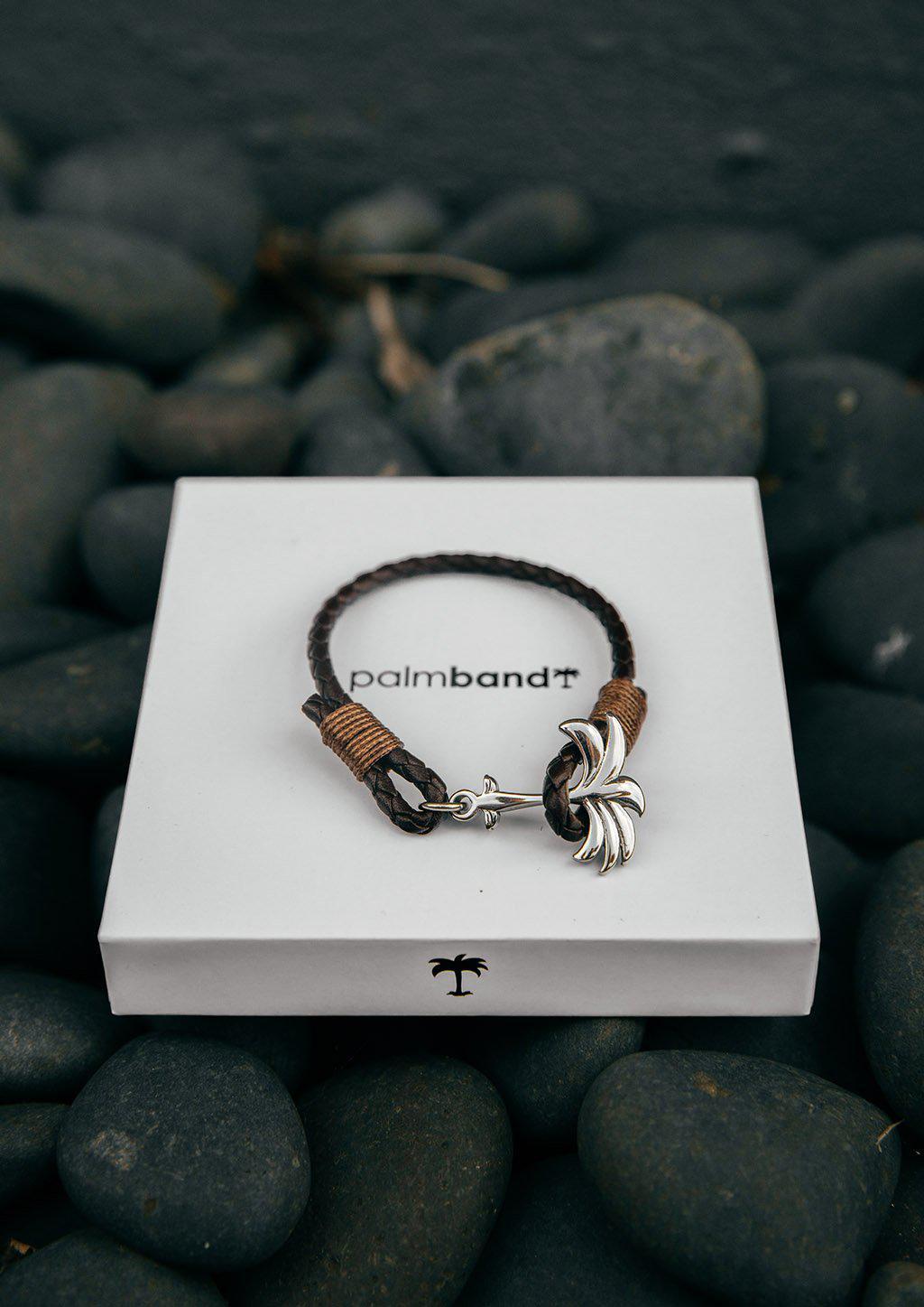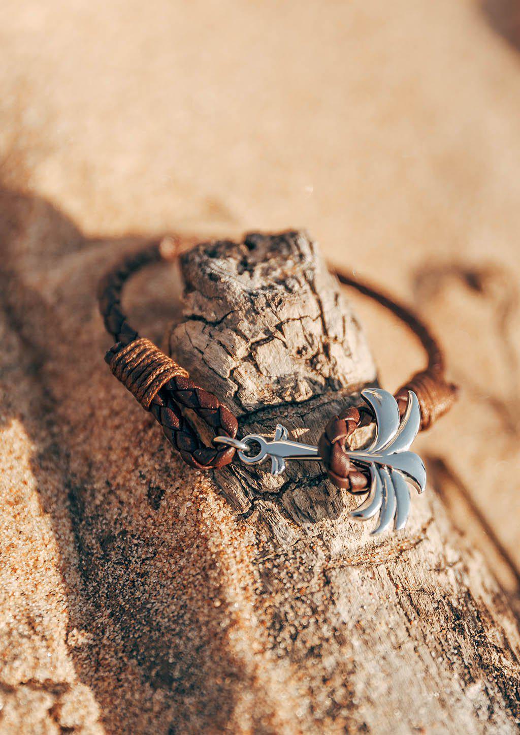 Oakland Palm Band featuring a brown leather strap and silver palm tree anchor, symbolizing happiness and tranquility.