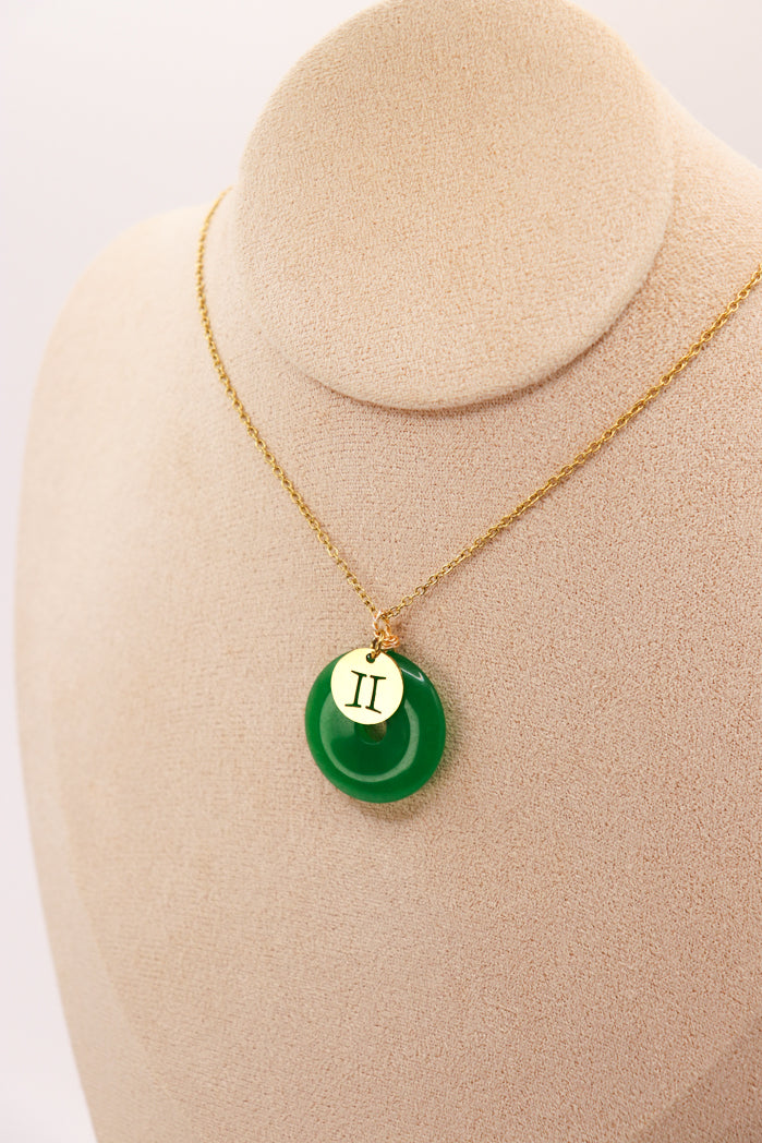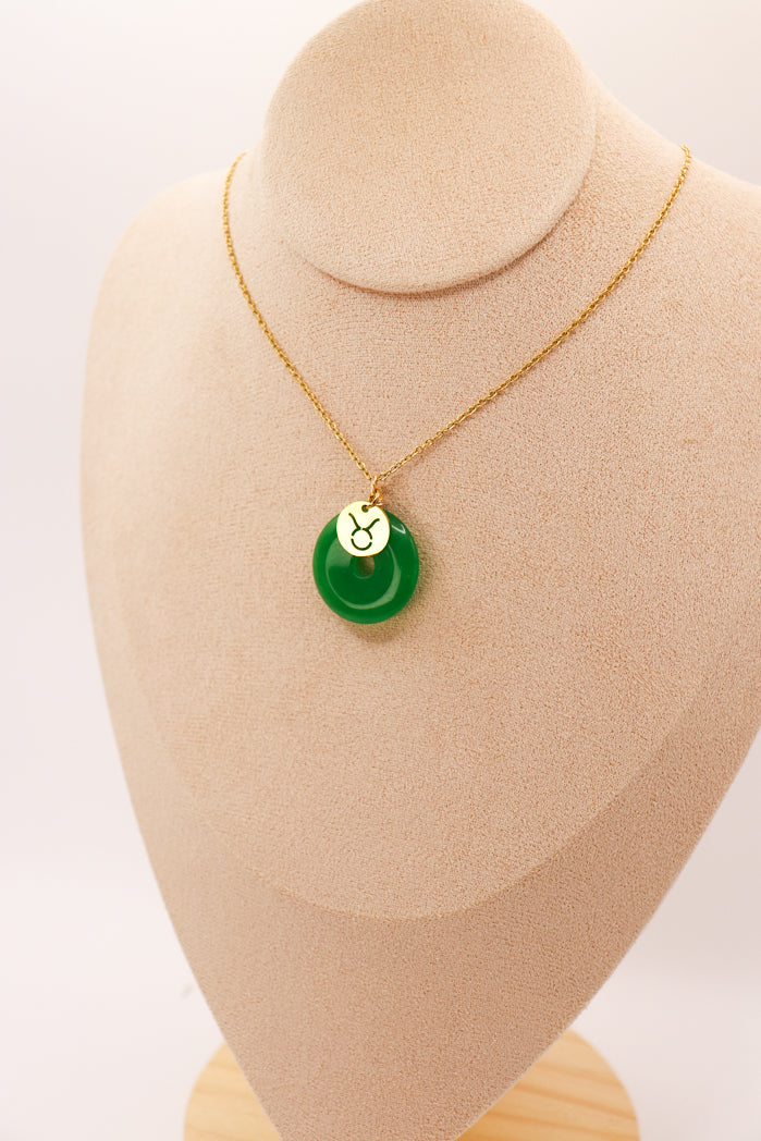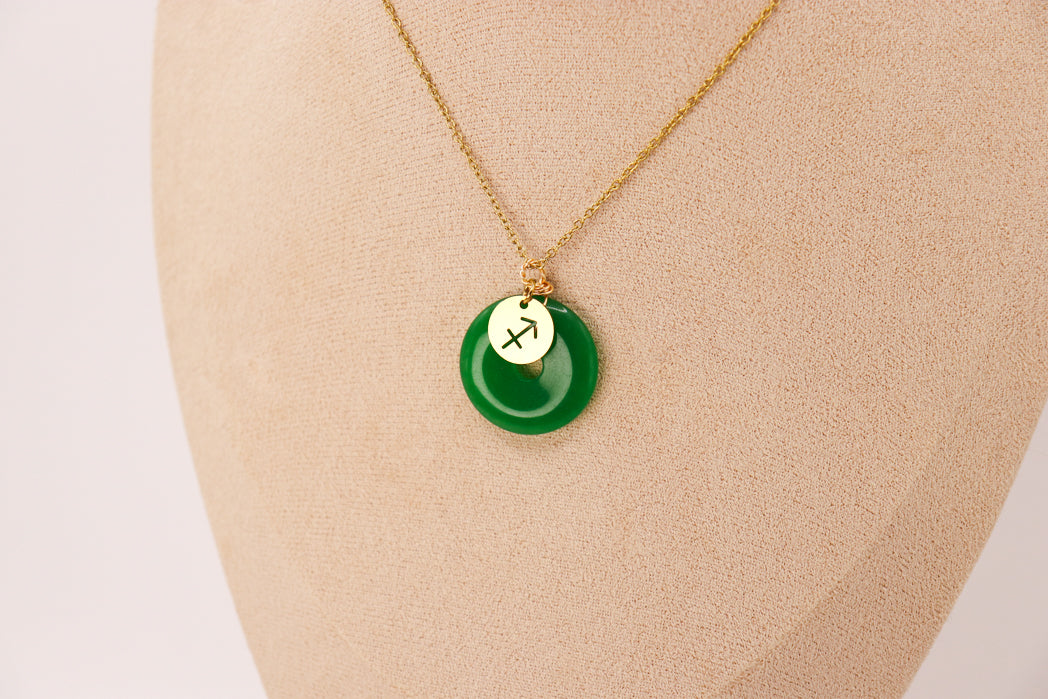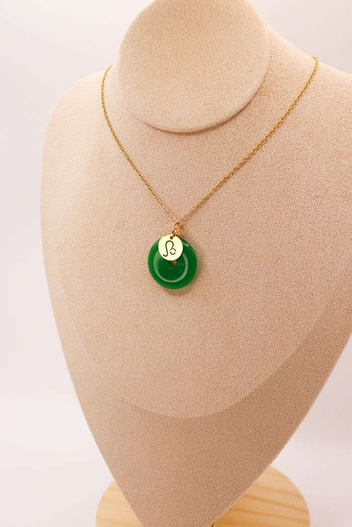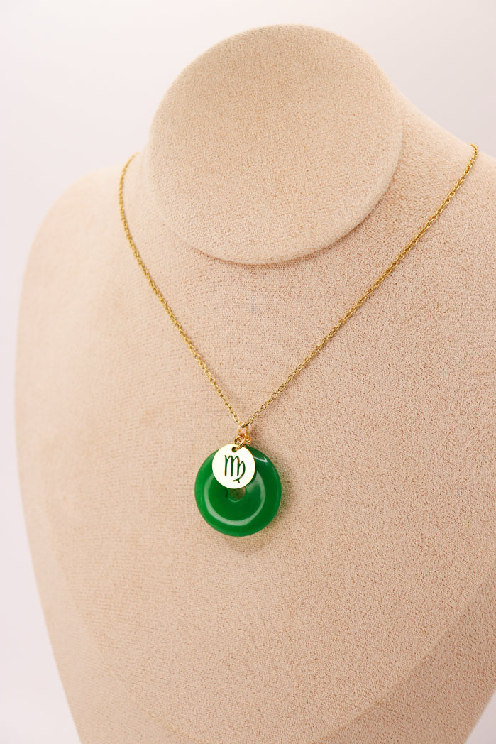 Pendentif donut en jade naturel avec charm représentant un signe astrologique, en cuivre plaqué Or 18k.