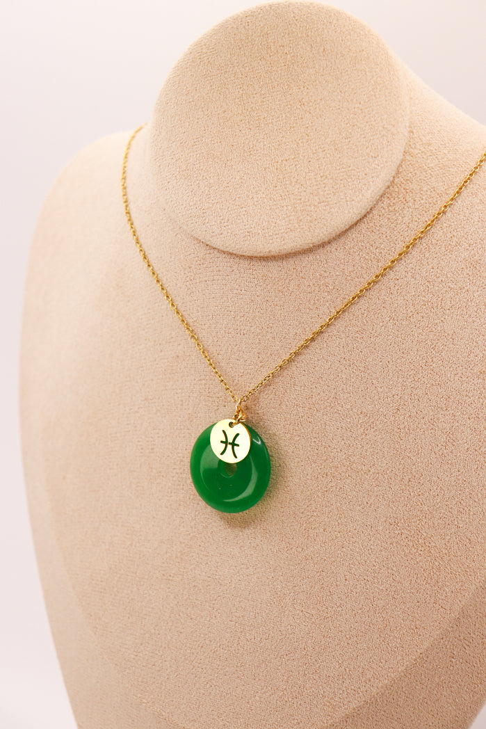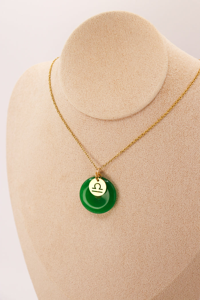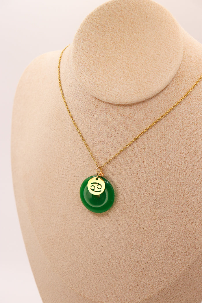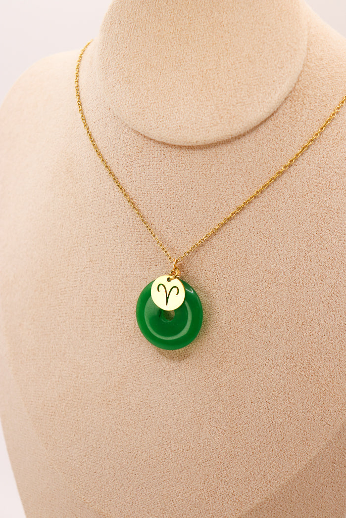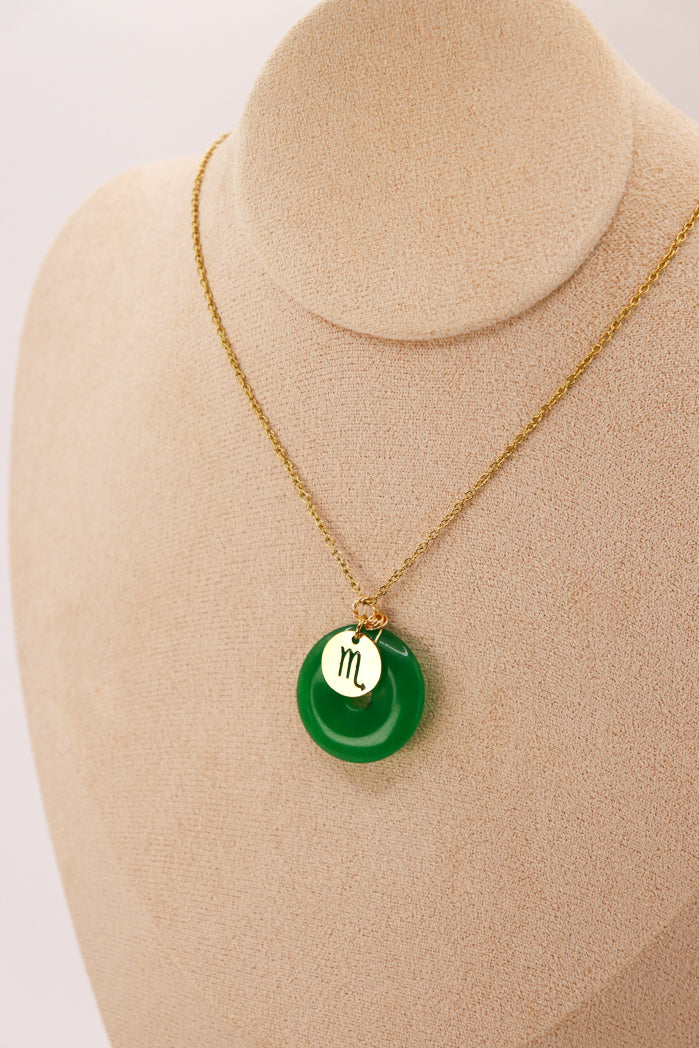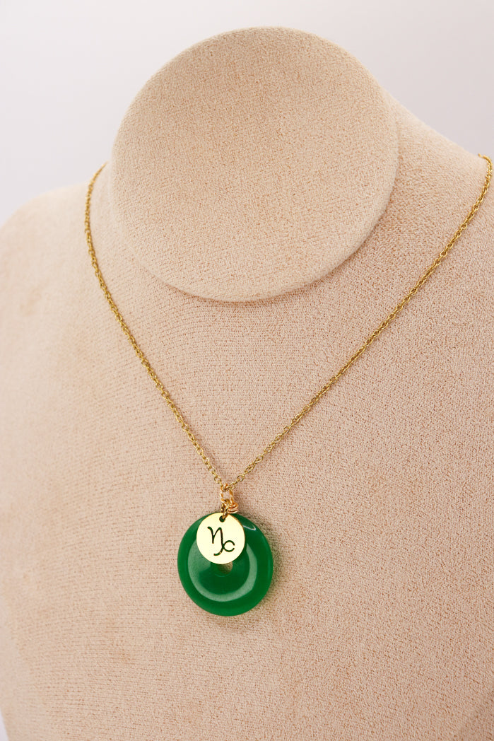Pendentif donut en jade naturel avec charm représentant un signe astrologique, en cuivre plaqué Or 18k.