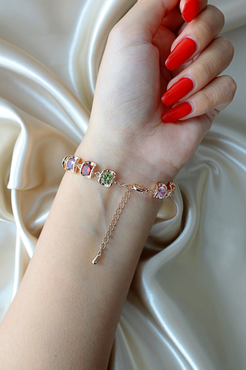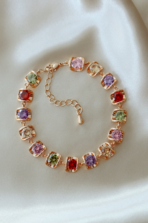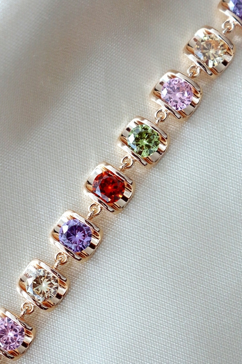 Beautiful and festive rainbow bracelet made with charms attached with original Swarovski Austrian gems and the 18 karat gold plated metal parts.
