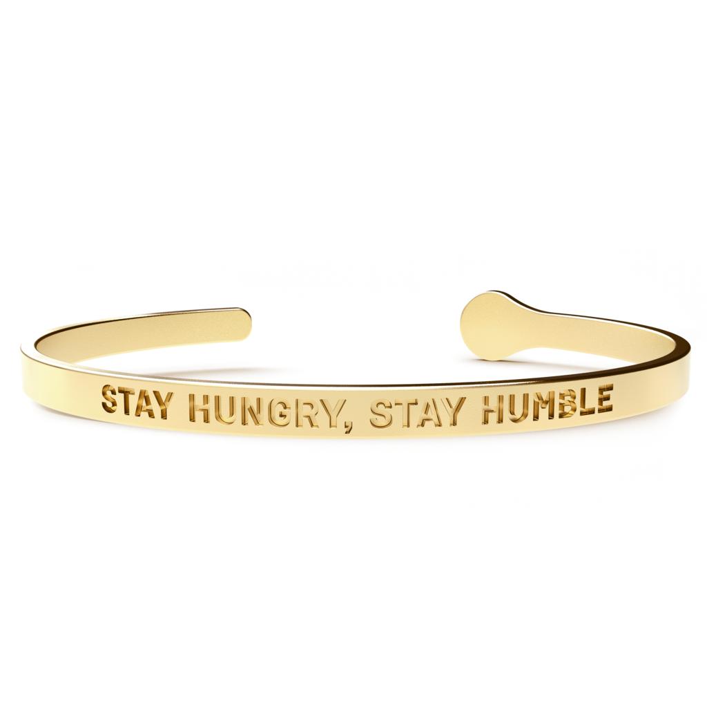 The 'Stay Hungry, Stay Humble' bracelet is a perfect accessory for those who appreciate both style and substance. Crafted from high-quality stainless steel, this bracelet is designed to withstand the test of time while making a bold statement. The 24k gold coating adds a touch of elegance, making it suitable for both casual and formal occasions. Whether you're dressing up for a night out or keeping it simple for a day at the office, this bracelet complements any outfit effortlessly. One of the standout features of this bracelet is its hypoallergenic properties. Made from lead-free materials, it is safe for individuals with sensitive skin, ensuring that you can wear it all day without irritation. Additionally, the corrosion and tarnish-resistant qualities of the stainless steel mean that it will maintain its shine and beauty even with regular wear. This durability makes it an ideal choice for those who lead an active lifestyle but still want to look fashionable. The 'Stay Hungry, Stay Humble' bracelet is designed to fit most wrist sizes, providing a comfortable and secure fit for everyone. Its versatile design allows it to be worn alone for a minimalist look or stacked with other bracelets for a more layered effect. This adaptability makes it a great addition to any jewelry collection. Caring for your bracelet is simple and straightforward. To keep it looking its best, clean it regularly with a soft cloth to remove any dirt or oils that may accumulate over time. It is important to avoid wearing the bracelet while showering or swimming, as exposure to water can compromise the integrity of the gold coating. Additionally, steer clear of harsh chemicals such as detergents, bleach, and strong soaps, as these can cause damage to the bracelet's finish. When not in use, store the bracelet in a smooth, non-abrasive space to prevent scratches and maintain its pristine condition. This bracelet is not just a piece of jewelry; it carries a motivational message that resonates with many. The phrase 'Stay Hungry, Stay Humble' serves as a reminder to pursue your goals with passion while remaining grounded and appreciative of your journey. It makes for a thoughtful gift for friends, family, or even yourself, encouraging a mindset of ambition and humility. Whether you're looking to treat yourself or searching for the perfect gift for a loved one, the 'Stay Hungry, Stay Humble' bracelet is a meaningful choice that combines style, durability, and inspiration. Its elegant design and powerful message make it a standout accessory that will be cherished for years to come. In summary, the 'Stay Hungry, Stay Humble' bracelet is a stylish and durable accessory that fits most wrist sizes. Its hypoallergenic, lead-free, and corrosion-resistant materials ensure comfort and longevity, while the 24k gold coating adds a luxurious touch. With easy care instructions and a motivational message, this bracelet is perfect for anyone looking to enhance their jewelry collection or find a meaningful gift.