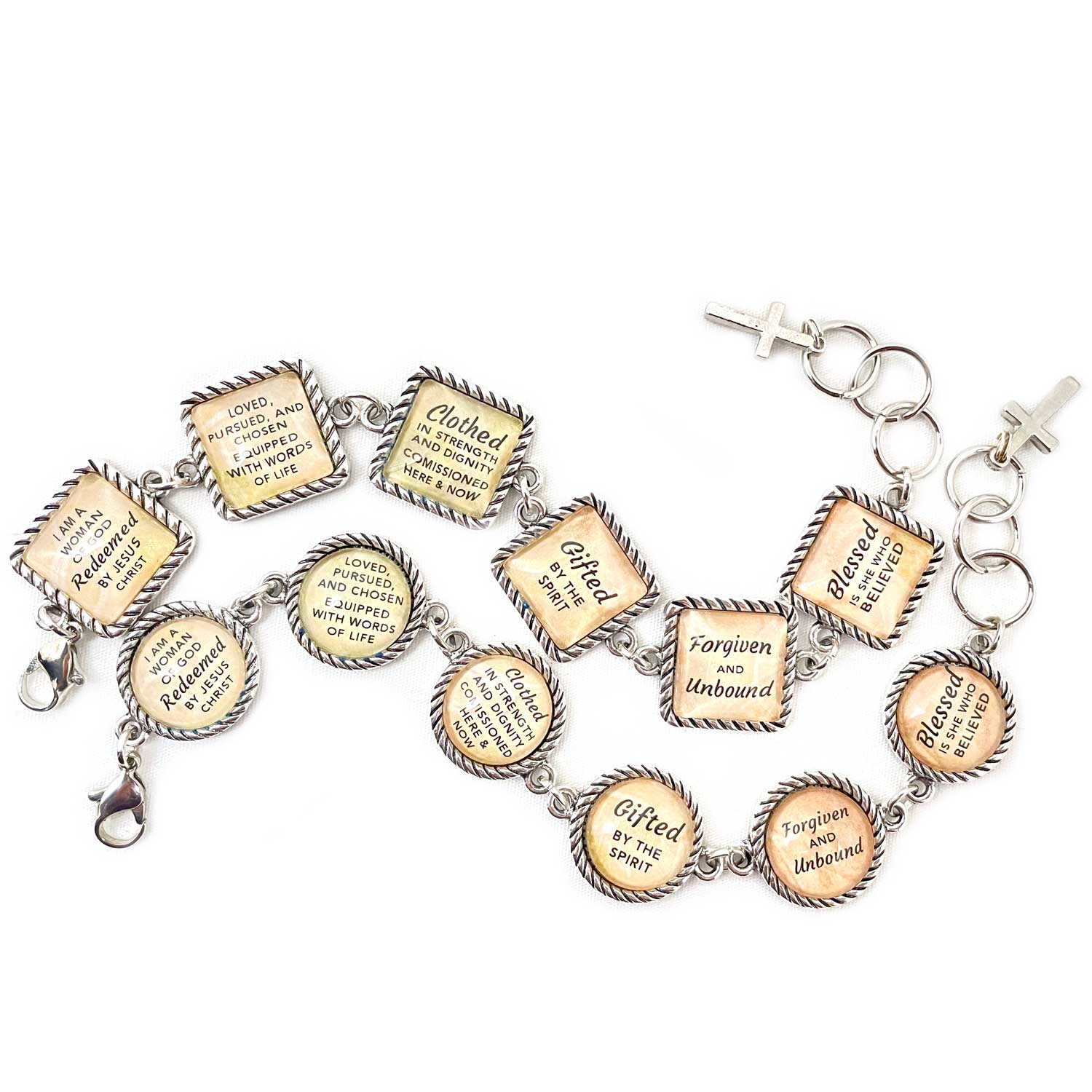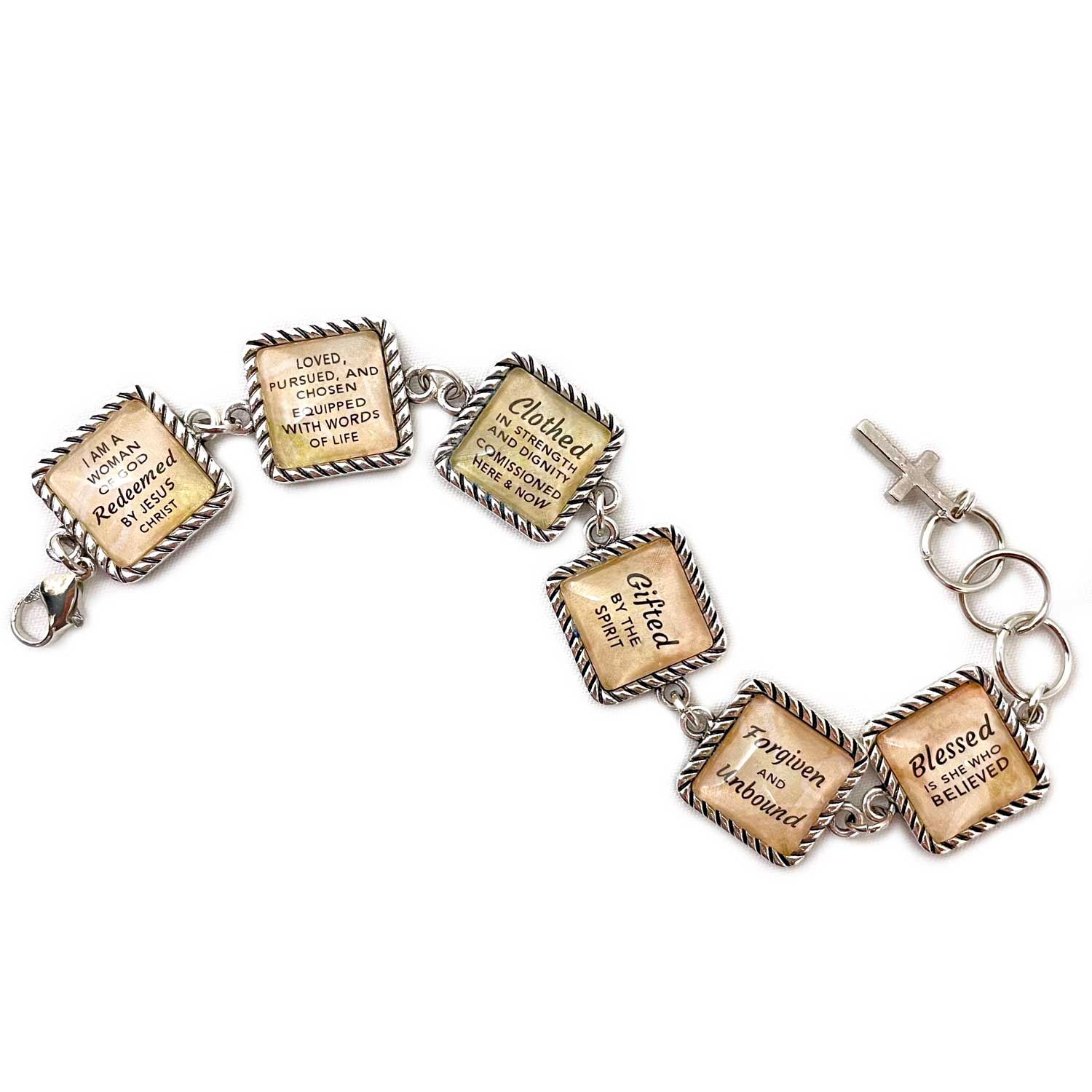 Each charm on the bracelet features powerful affirmations that resonate deeply with women of faith. Phrases such as 'Redeemed by Jesus Christ', 'Clothed in strength and dignity', and 'Blessed is she who believed' are not just words; they are reminders of the love, grace, and strength that God provides. Wearing this bracelet allows the recipient to carry these affirmations with them, serving as a source of encouragement and inspiration throughout their day.