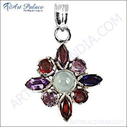 A beautiful 925 sterling silver pendant featuring natural multi gemstones, showcasing intricate design and craftsmanship.