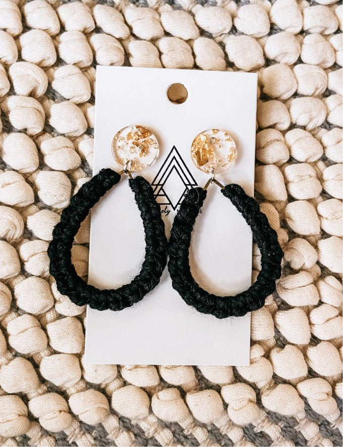 A pair of elegant Black Gems made from macrame cotton and resin, showcasing a lightweight and stylish design.