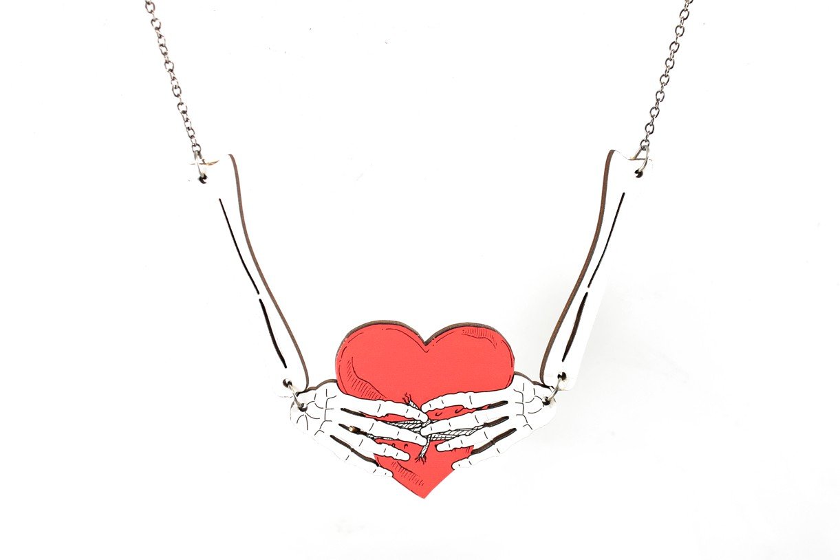 Bone Heart Necklace #6151 made from sustainably sourced wood with a stainless steel chain, featuring a laser-cut design and natural wood back.