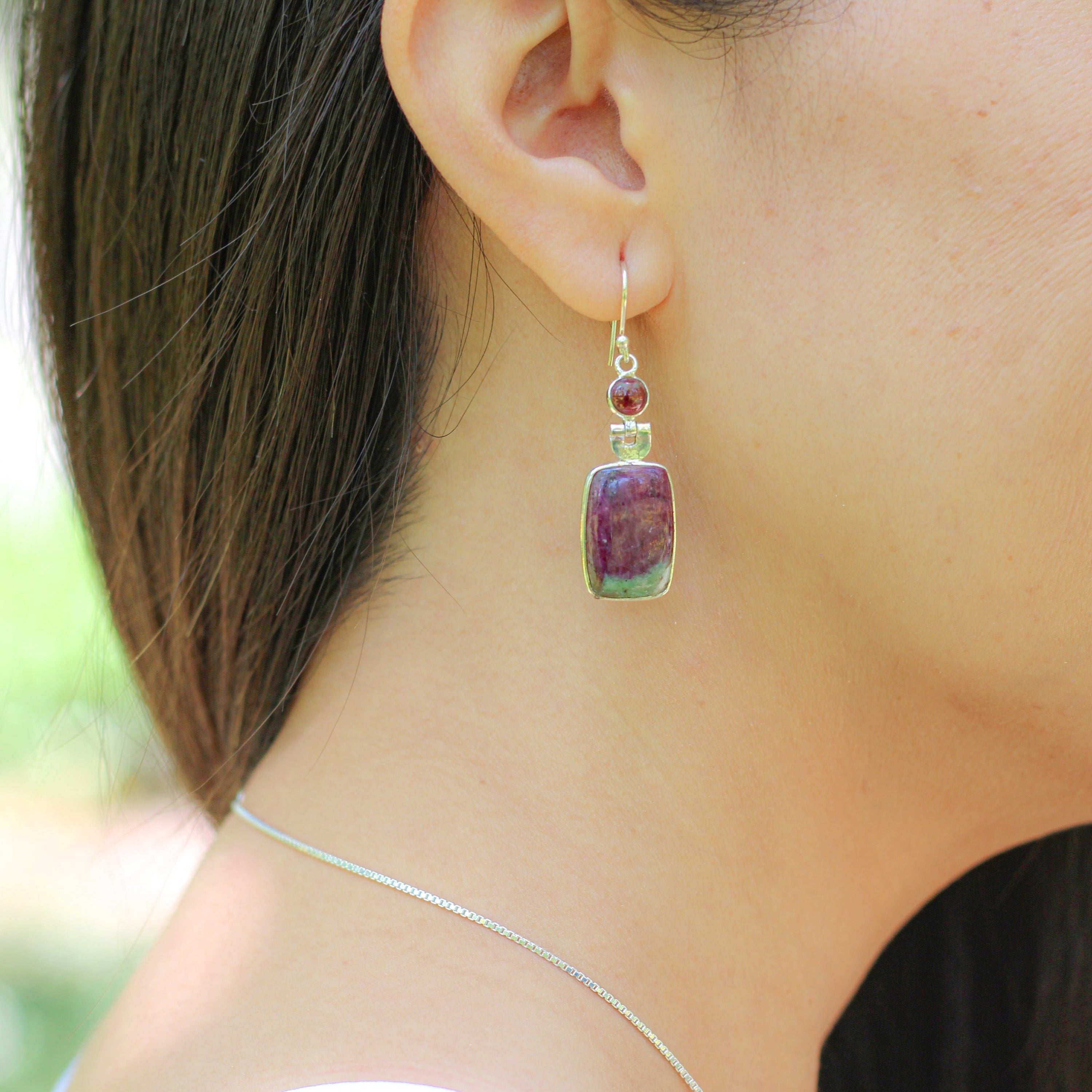 Boucles d'oreilles pendantes en rubis zoisite et argent 925, ornées d'une perle en grenat, symbolisant l'intelligence du cœur.