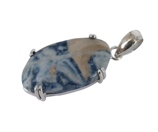 Colorless Blue Scheelite Stone set in a sterling silver pendant, showcasing its vibrant blue hue and elegant design.