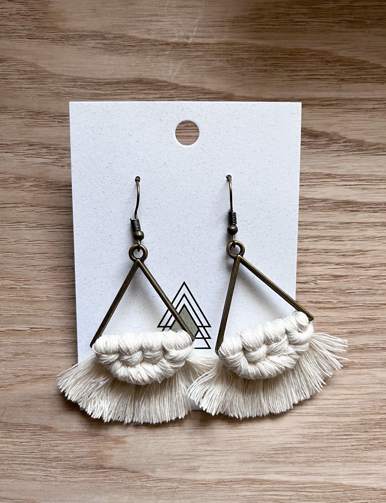 Macrame cotton is a popular choice for jewelry due to its durability and softness. It is a natural fiber that is not only eco-friendly but also provides a unique texture and appearance. The use of macrame cotton in our Cream Triangle Earrings ensures that you are wearing a product that is both stylish and sustainable.