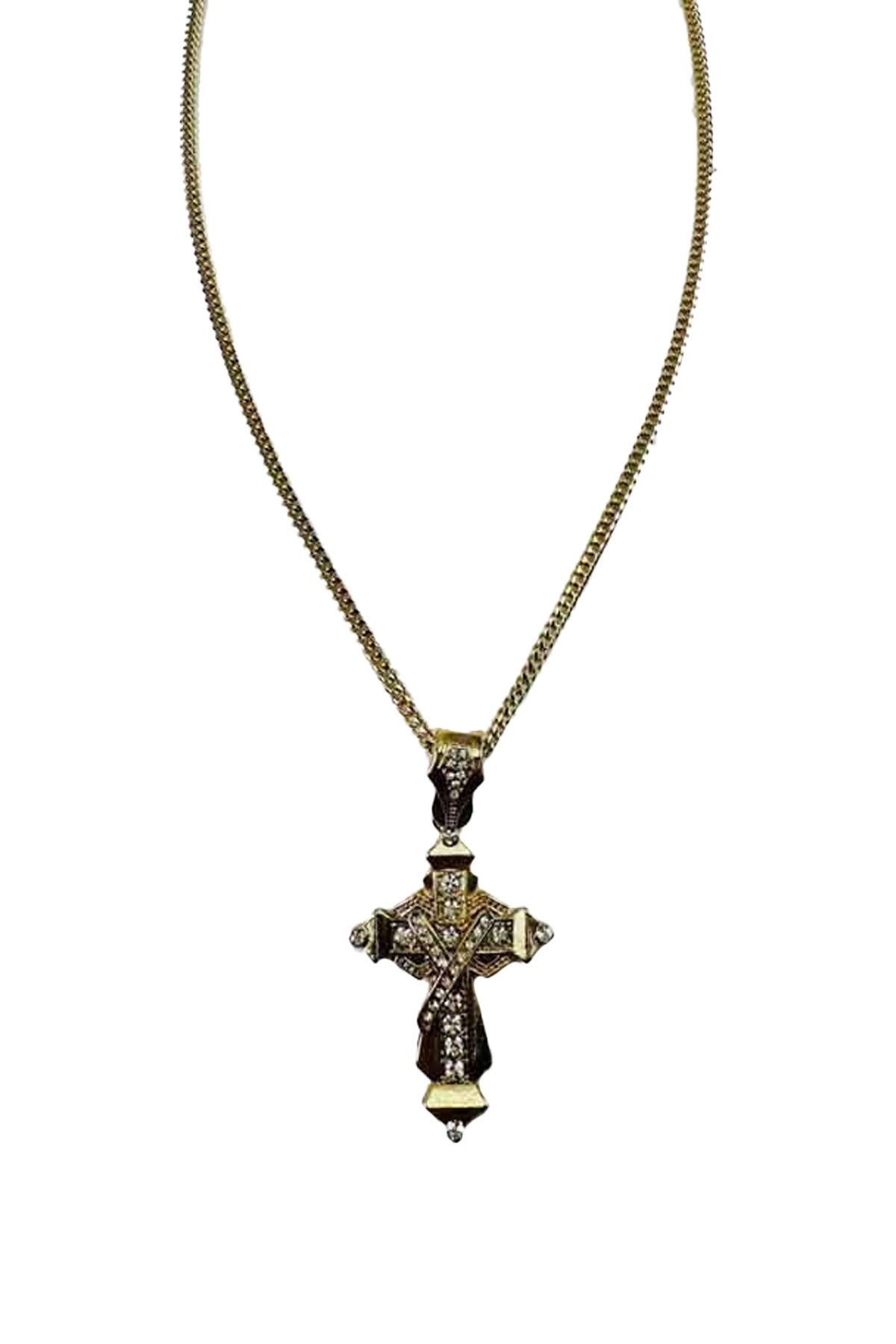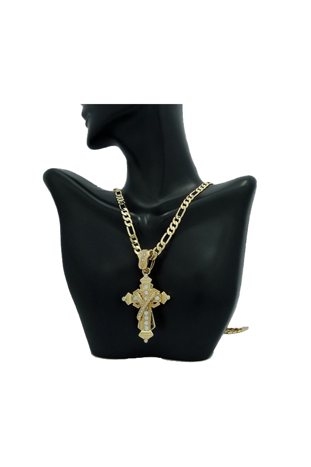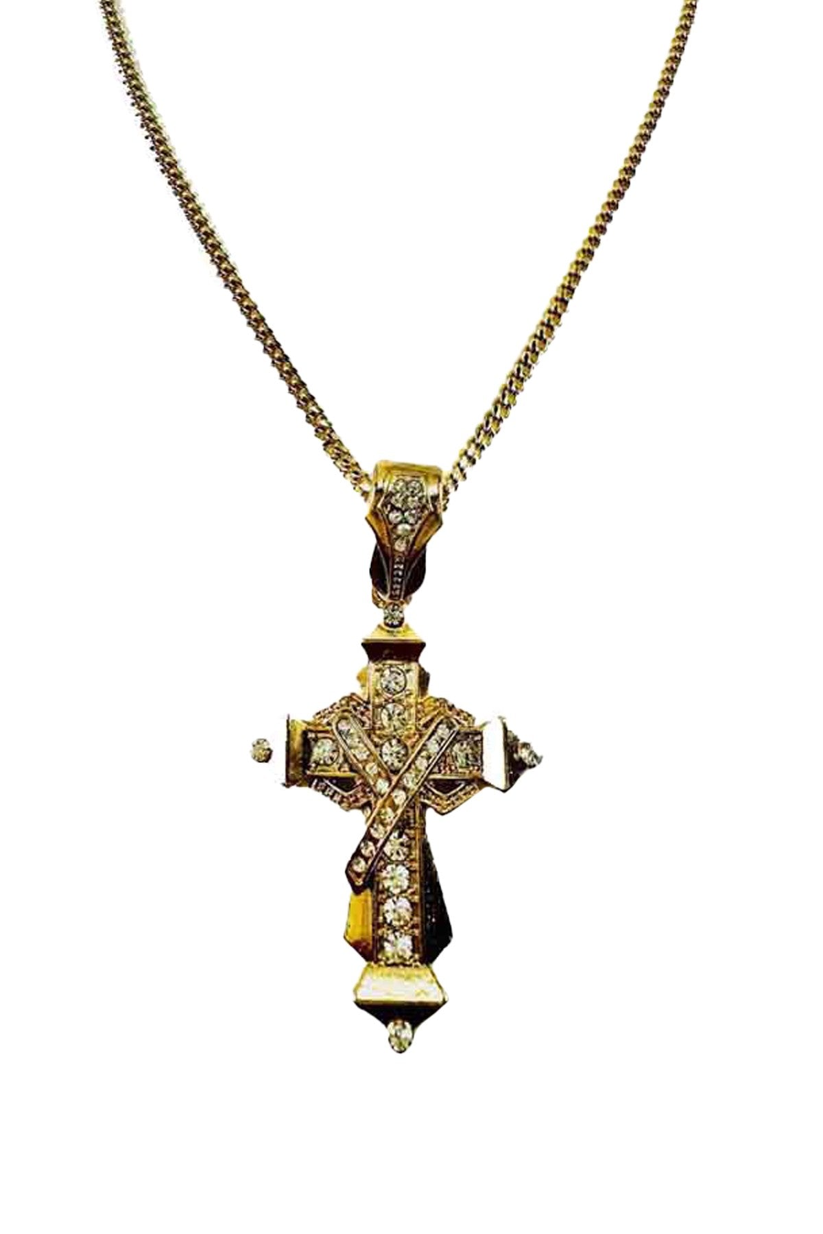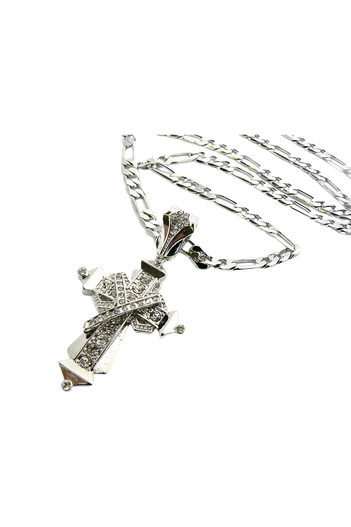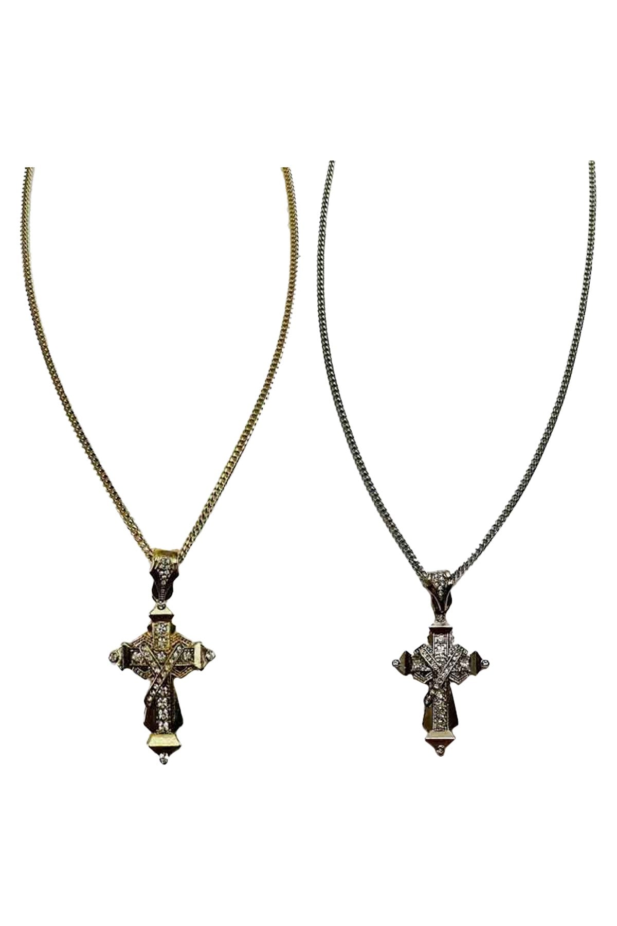 The centerpiece of this necklace is the cross pendant, measuring approximately 1.75 inches by 1.375 inches. The intricate detailing and shimmering rhinestones create a captivating look that draws attention and adds a touch of elegance to your ensemble. Whether you're dressing up for a special occasion or adding flair to your everyday wear, this necklace is the perfect choice.