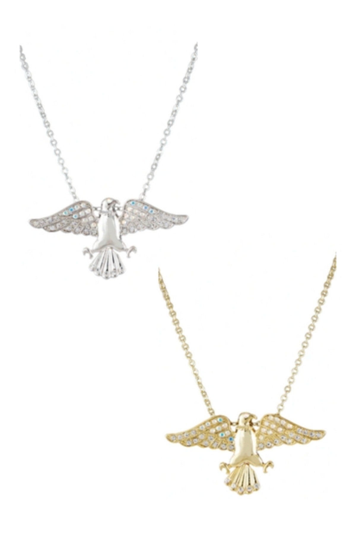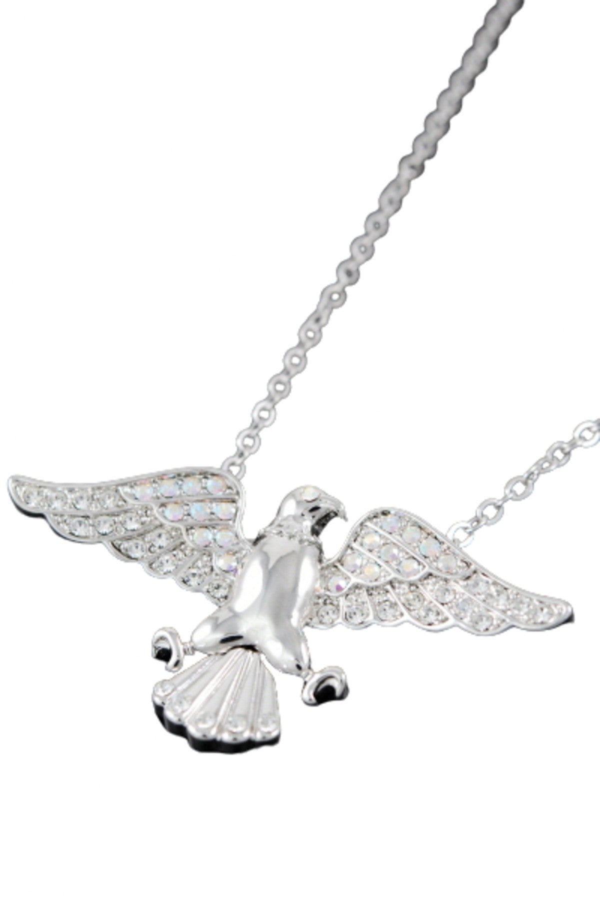 A beautiful crystal eagle pendant necklace with double plating, featuring a 17-inch chain and a lobster claw clasp, elegantly displayed.