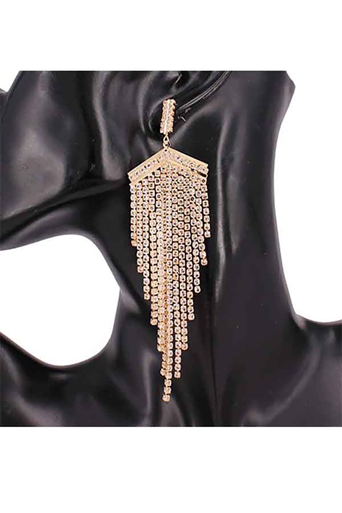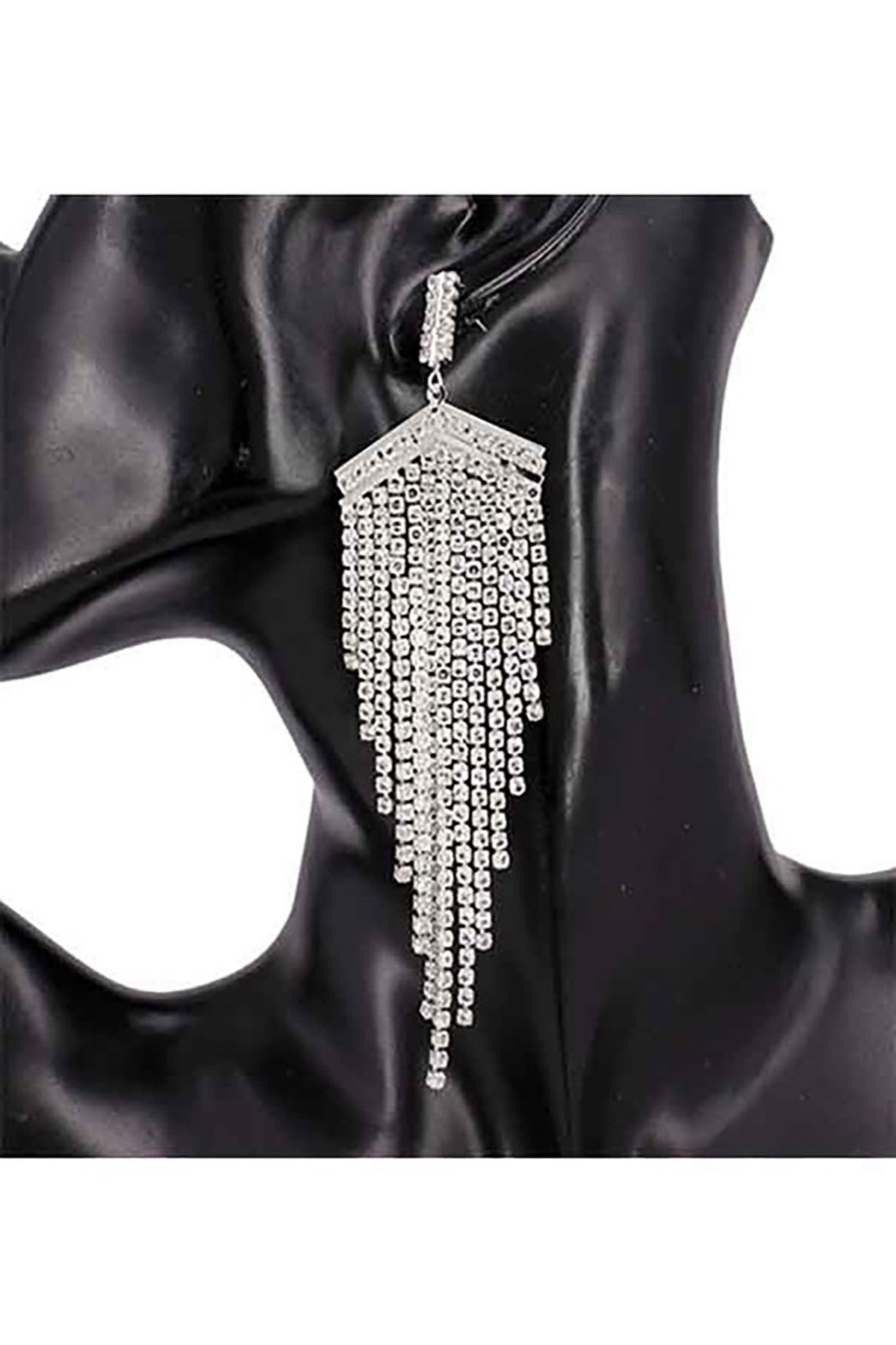 Elegant Crystal Fringe Earrings with sparkling crystals, measuring 1.25 x 5 inches, featuring a secure post back closure.