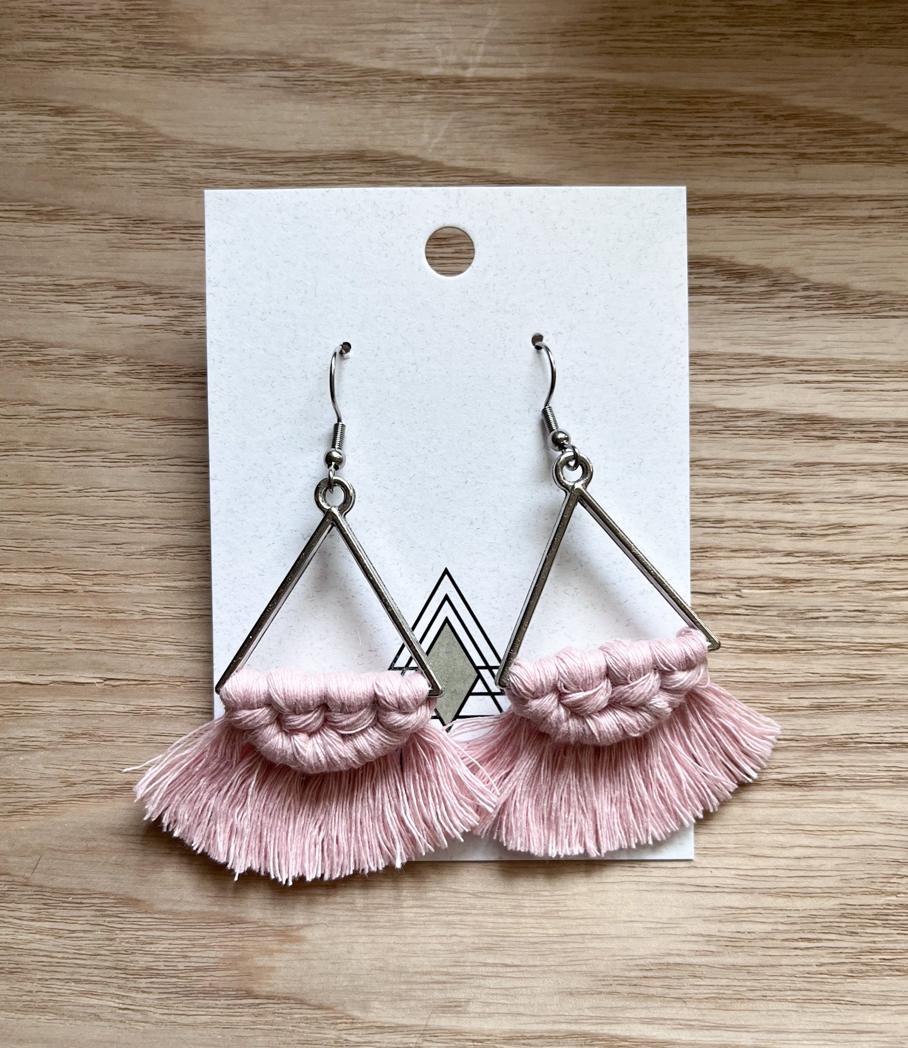 Dusty Rose Silver Triangles earrings made from natural cotton with stainless steel hooks, showcasing a stylish and lightweight design.
