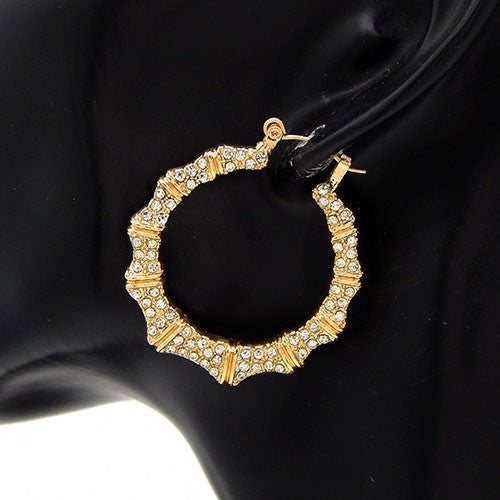 Elegant rhinestone bamboo shape hoop earrings with latch back closure, showcasing a unique design and sparkling embellishments.