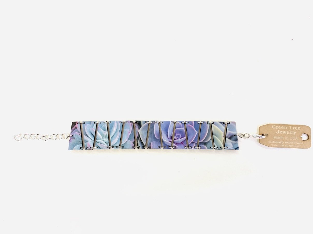 The Echeveria Bracelet #7553 is a unique and stylish accessory that combines fashion with functionality. Made in the U.S.A., this bracelet is crafted from sustainably sourced wood, ensuring that you are making an eco-friendly choice while looking fabulous. The bracelet features a beautiful design that showcases an image on the front, complemented by a natural wood back that adds a touch of rustic charm.