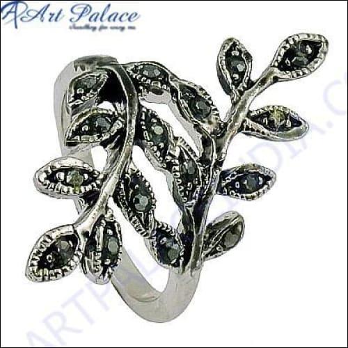 Elegant Leaf-Style Gun Metal Gemstone Silver Ring showcasing intricate leaf design and shimmering gemstone.