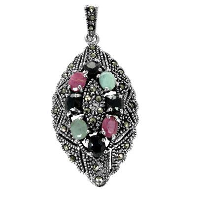 Introducing our exquisite Emerald, Marcasite, Ruby, and Sapphire Gemstone Silver Pendant, a stunning piece that embodies elegance and sophistication. This pendant is not just a piece of jewelry; it's a statement of style and luxury, perfect for those who appreciate the finer things in life. Crafted with precision and care, this pendant showcases a beautiful combination of vibrant gemstones set in high-quality silver, making it an ideal choice for wholesale buyers looking to enhance their jewelry collection.