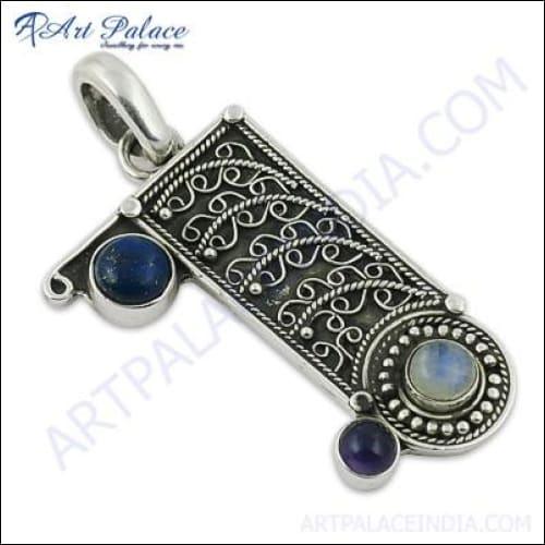 The Ethnic Designer Silver Pendant with Amethyst & Rainbow Moonstone is a stunning piece of jewelry that embodies the rich cultural heritage of India. Crafted by Art Palace, Jaipur, a renowned manufacturer and exporter since 1981, this pendant showcases the exquisite artistry and craftsmanship that the region is famous for. The pendant is not just a piece of jewelry; it is a statement of elegance and sophistication.