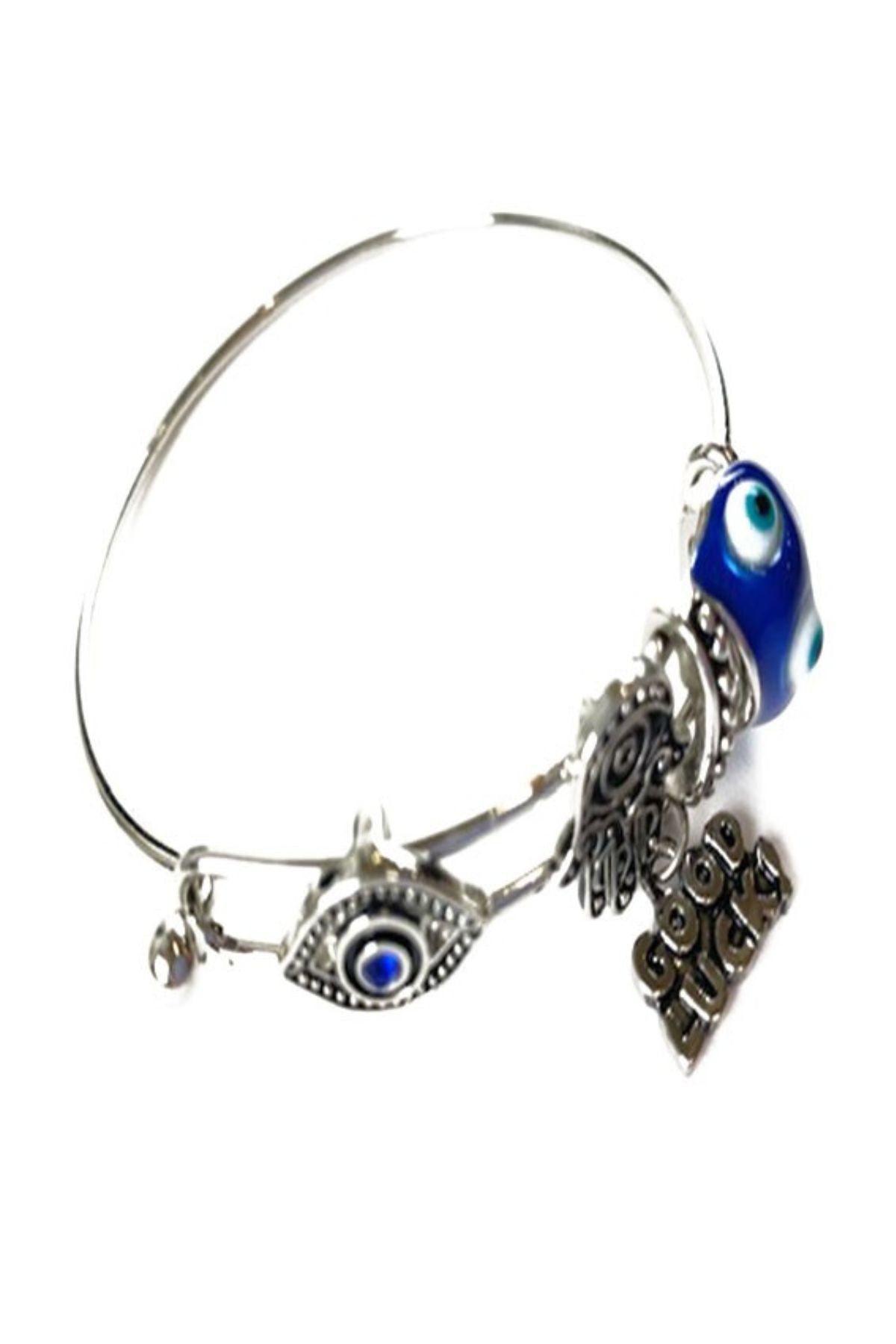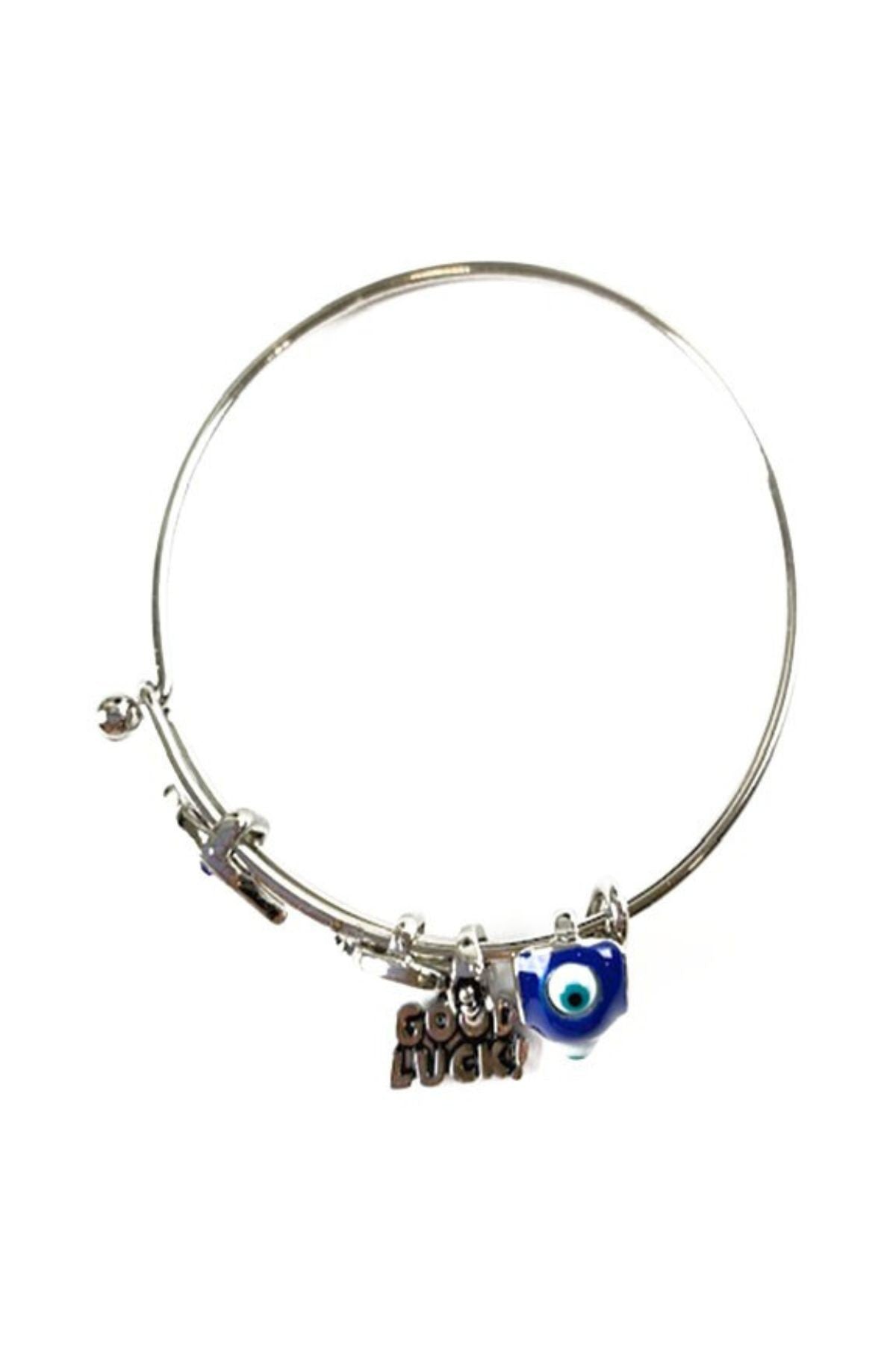 A stylish Evil Eye Charm Bracelet featuring a blue and white evil eye symbol, approximately 2.3 inches in diameter with a secure hook closure.