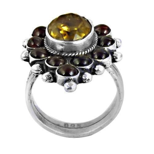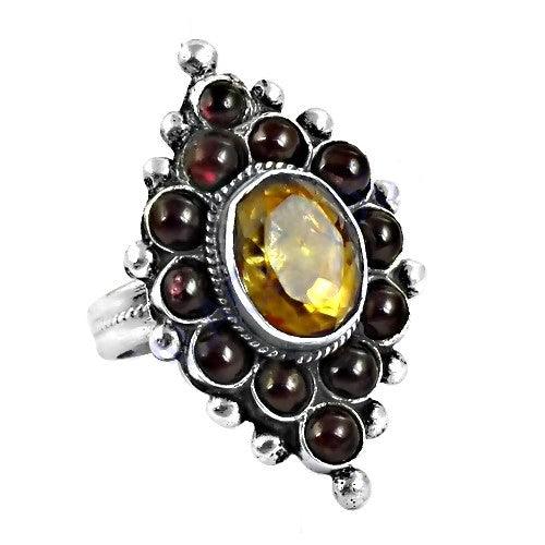 The citrine and garnet gemstones used in this ring are carefully selected for their quality and brilliance. Citrine, known for its warm yellow hues, is believed to bring positivity and energy to its wearer. Garnet, with its deep red tones, symbolizes love and passion. Together, these gemstones create a striking contrast that enhances the overall beauty of the ring. Whether you are looking to make a statement or simply add a touch of elegance to your outfit, this ring is the perfect choice.