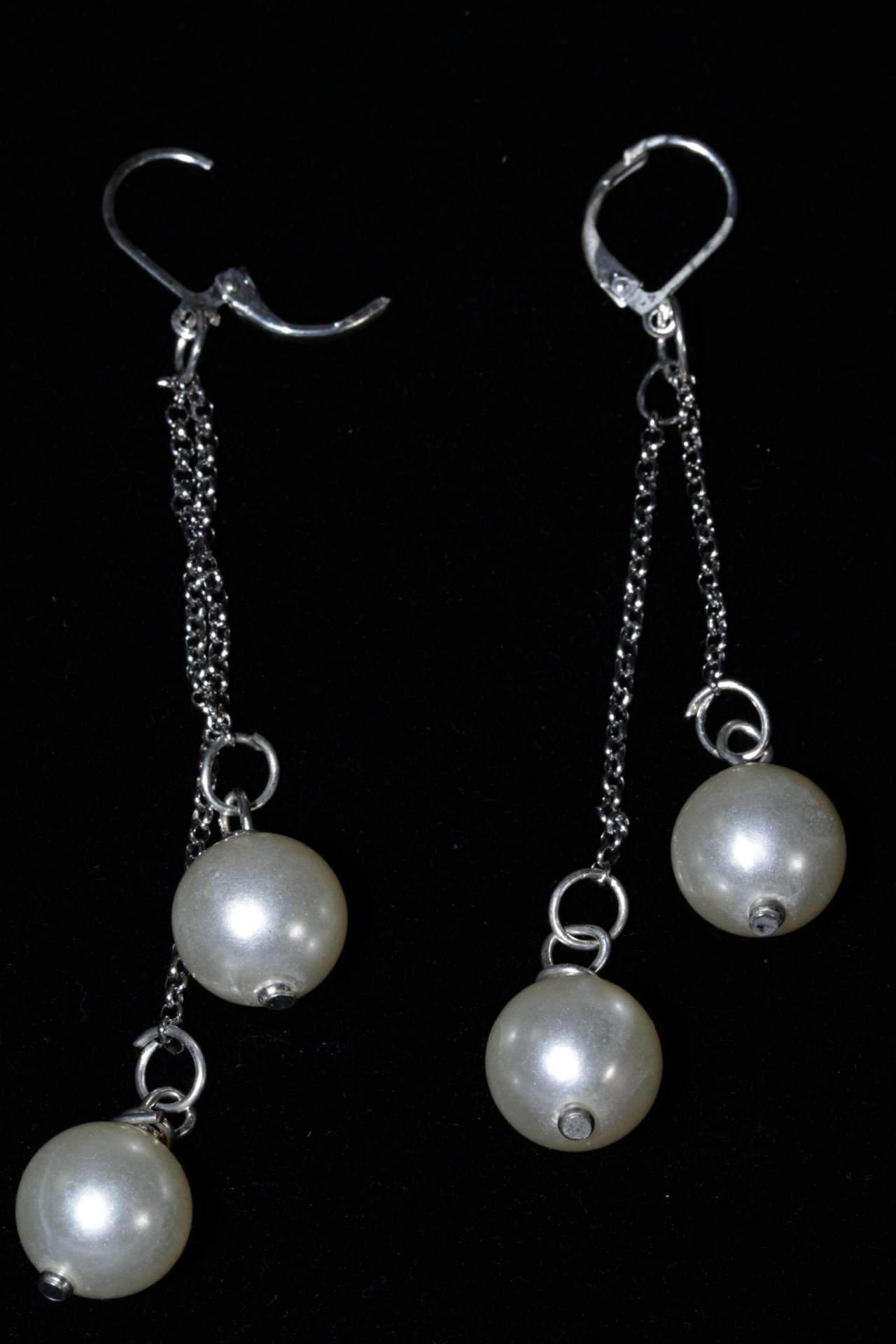 Elegant faux pearls dangle earrings in gold and silver tones, showcasing their graceful design and length.
