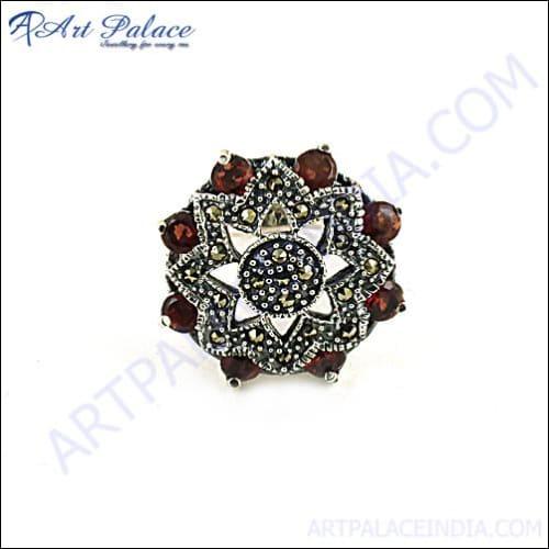 The Glamour Garnet Gun Metal Silver Ring is adorned with marcasite, a gemstone that adds a vintage charm to the overall design. Marcasite is known for its unique luster and is often used in jewelry to create intricate patterns and designs. The contrast between the deep garnet and the shimmering marcasite creates a mesmerizing effect that enhances the ring's aesthetic appeal.