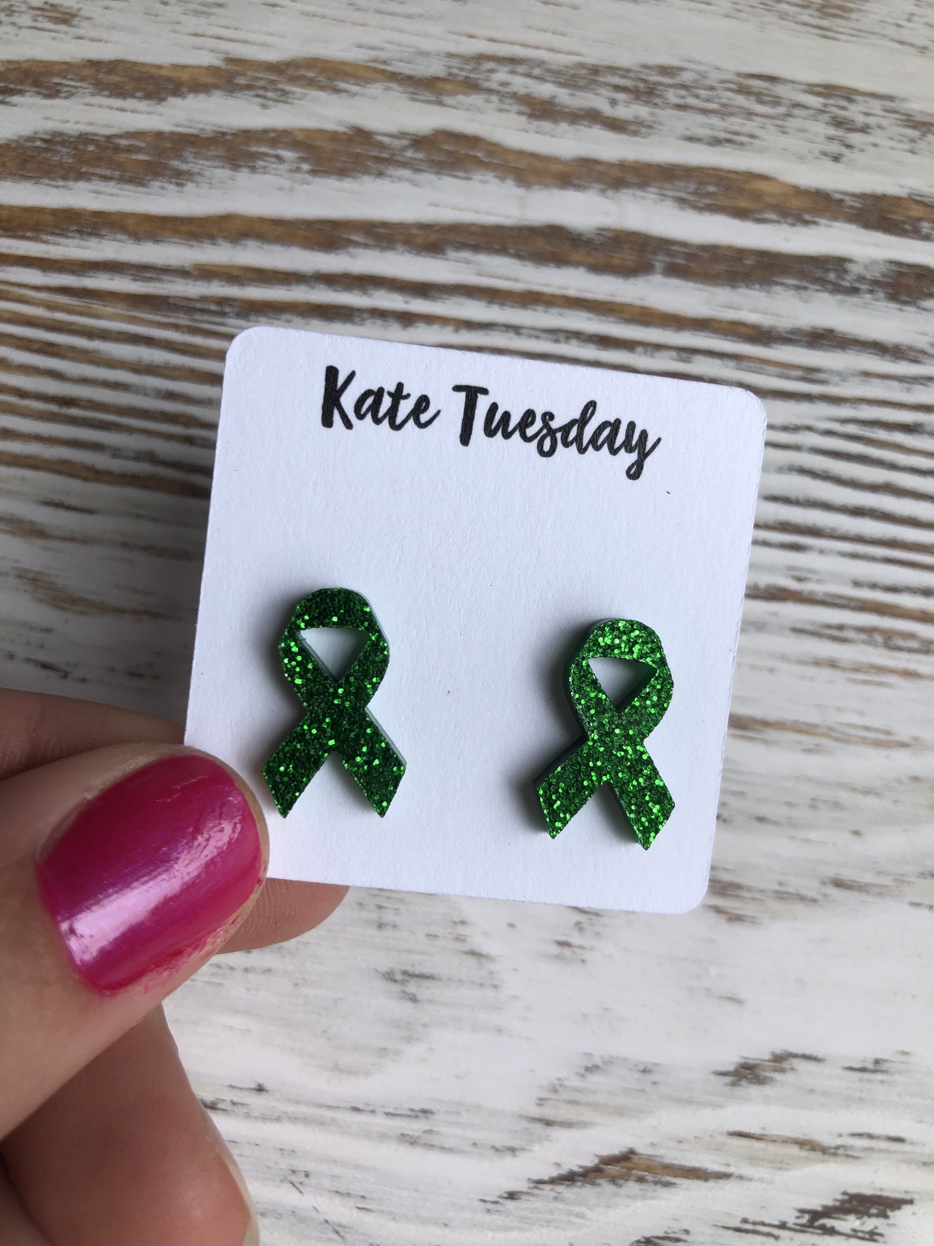 Crafted from high-quality acrylic, these earrings feature a sparkly green finish that catches the light beautifully. The vibrant green color symbolizes hope and renewal, making these earrings a powerful statement piece. Whether you're attending a cancer awareness event or simply want to add a pop of color to your outfit, these earrings are sure to turn heads.