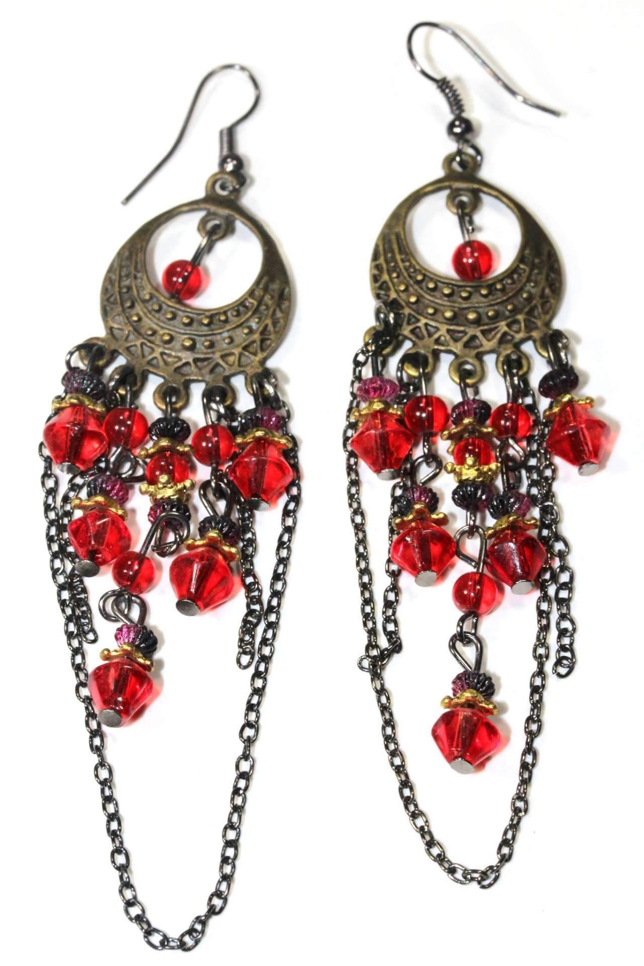 Handmade gypsy style chandelier earrings featuring chain links and shiny beads in various colors, showcasing intricate craftsmanship.