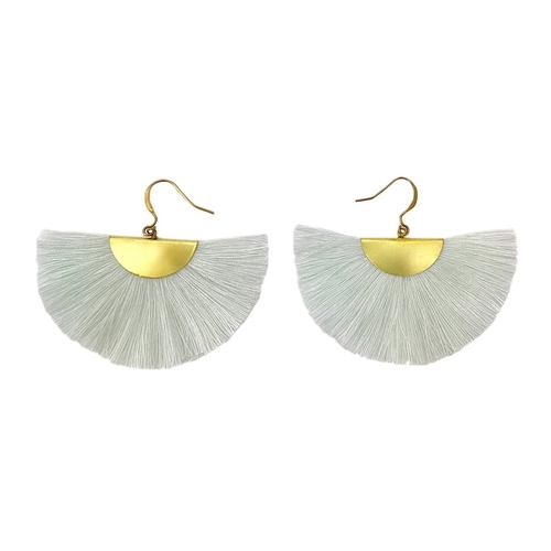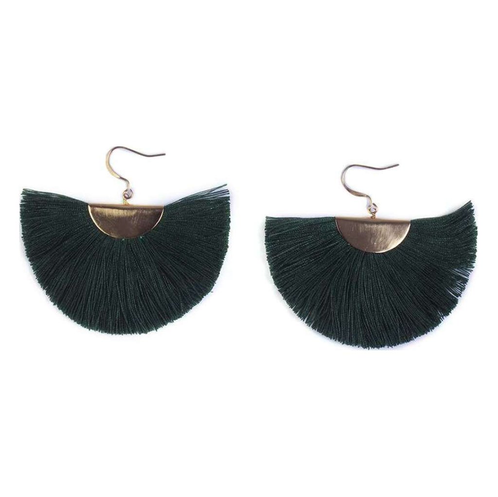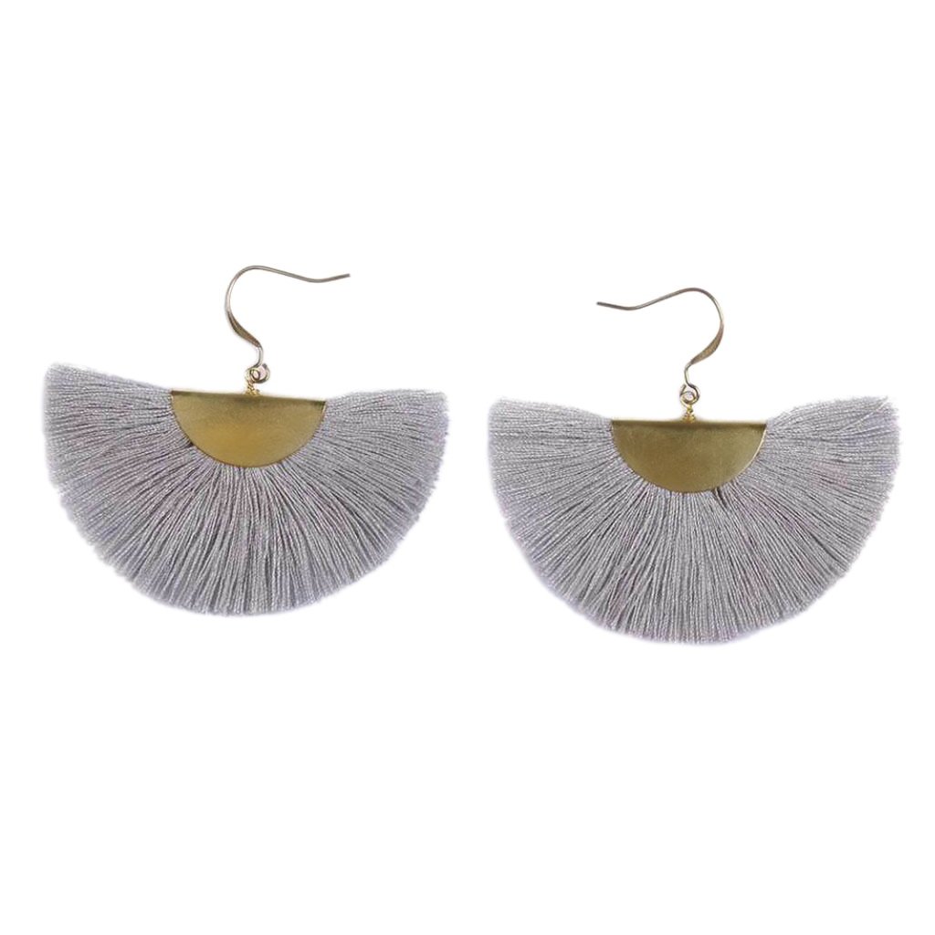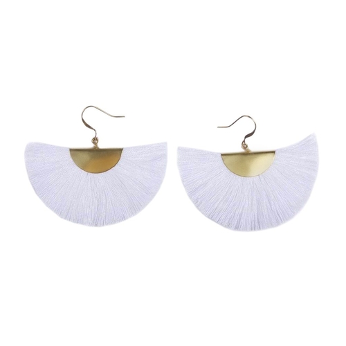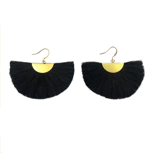 Introducing our stunning Half Moon Fan Earrings, a perfect accessory to elevate your style and add a pop of color to any outfit. These earrings are designed with a bohemian flair, featuring beautiful mini cotton tassels that are intricately wrapped in waxed thread. Despite their generous size of 3 inches in length and width, these earrings are remarkably lightweight, ensuring comfort for all-day wear. Whether you're dressing up for a special occasion or adding a touch of flair to your everyday look, these earrings are versatile enough to complement any outfit.