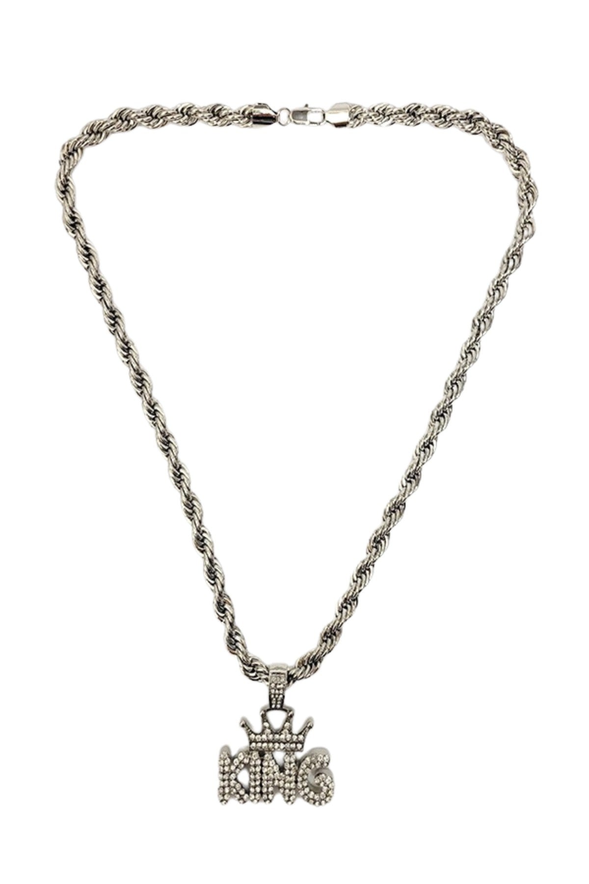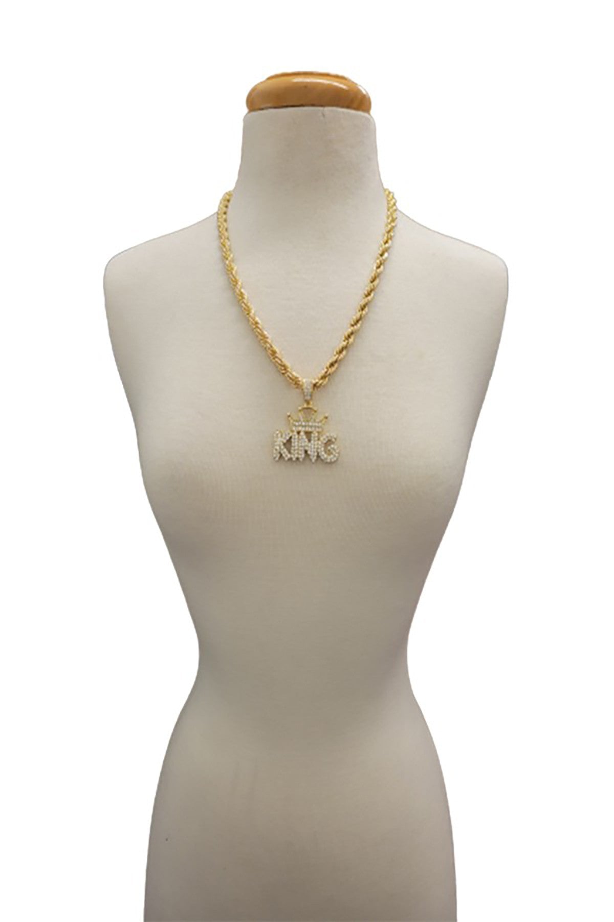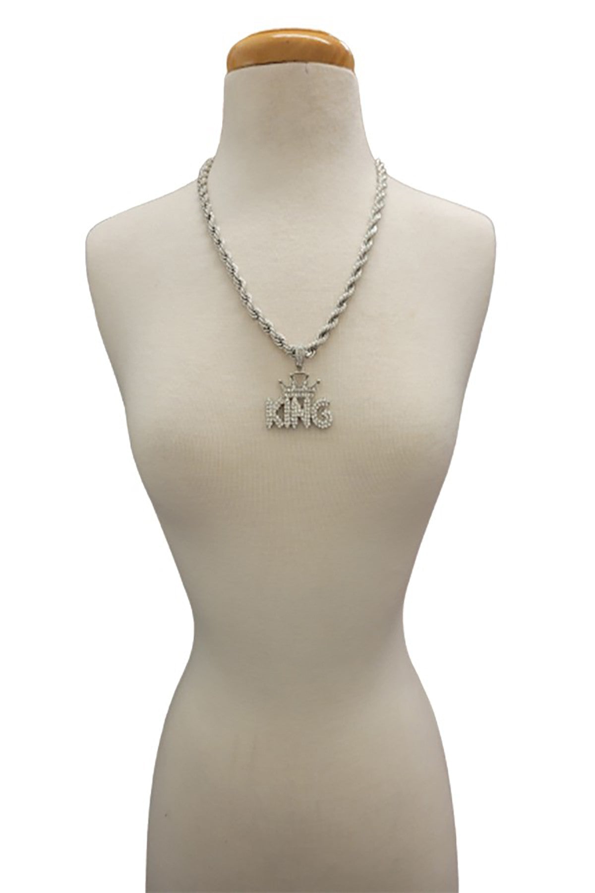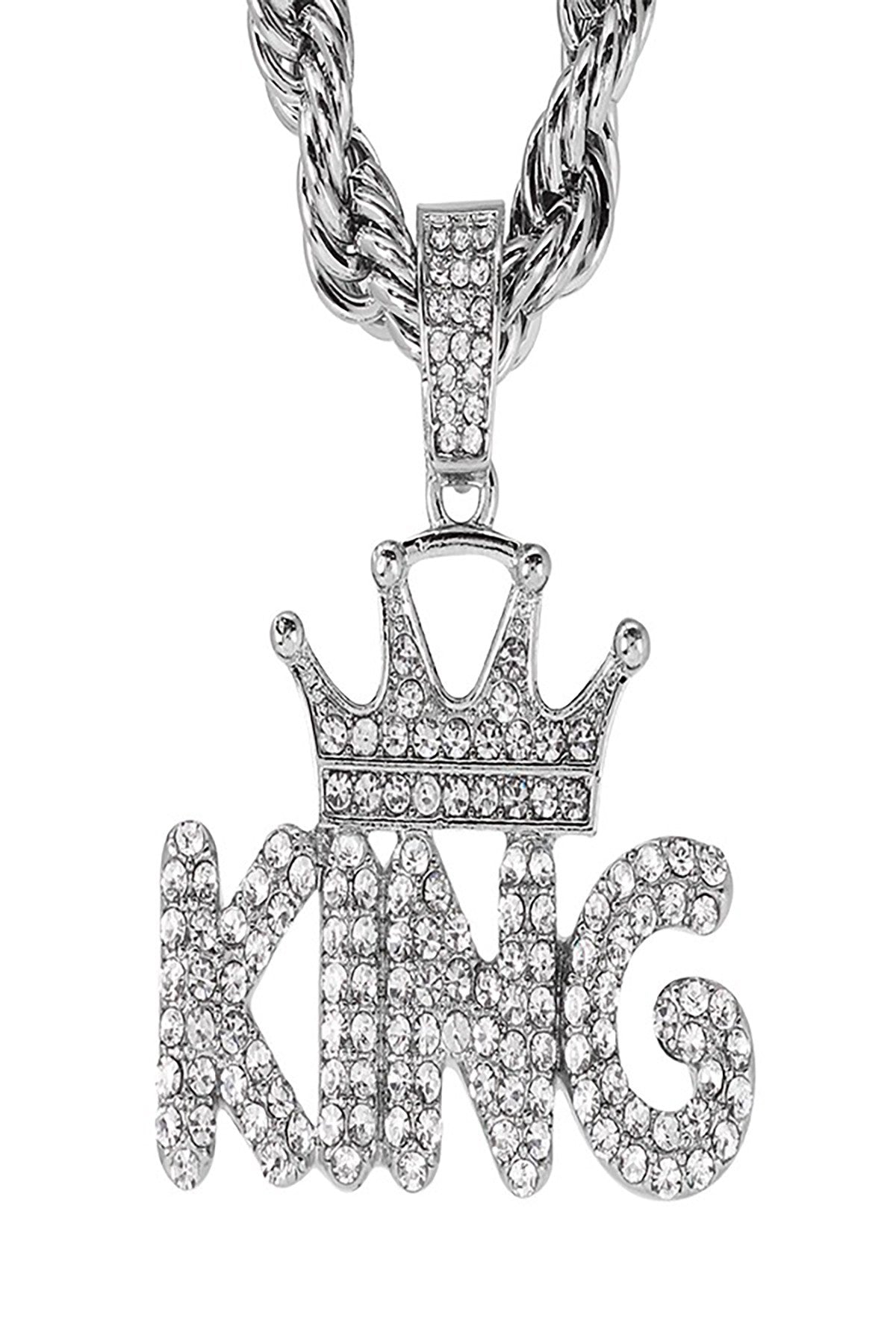 The pendant features a striking design that measures 2.0 inches in length, making it a noticeable addition to any ensemble. The word 'KING' is elegantly displayed, measuring 1.8 inches by 1.2 inches, showcasing your royal flair. The pendant is adorned with sparkling stones that catch the light beautifully, ensuring you stand out in any crowd.
