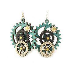 Kinetic Gear Earrings 5003E featuring moving gears in teal, natural wood, and black satin, designed for style and essential oil diffusion.