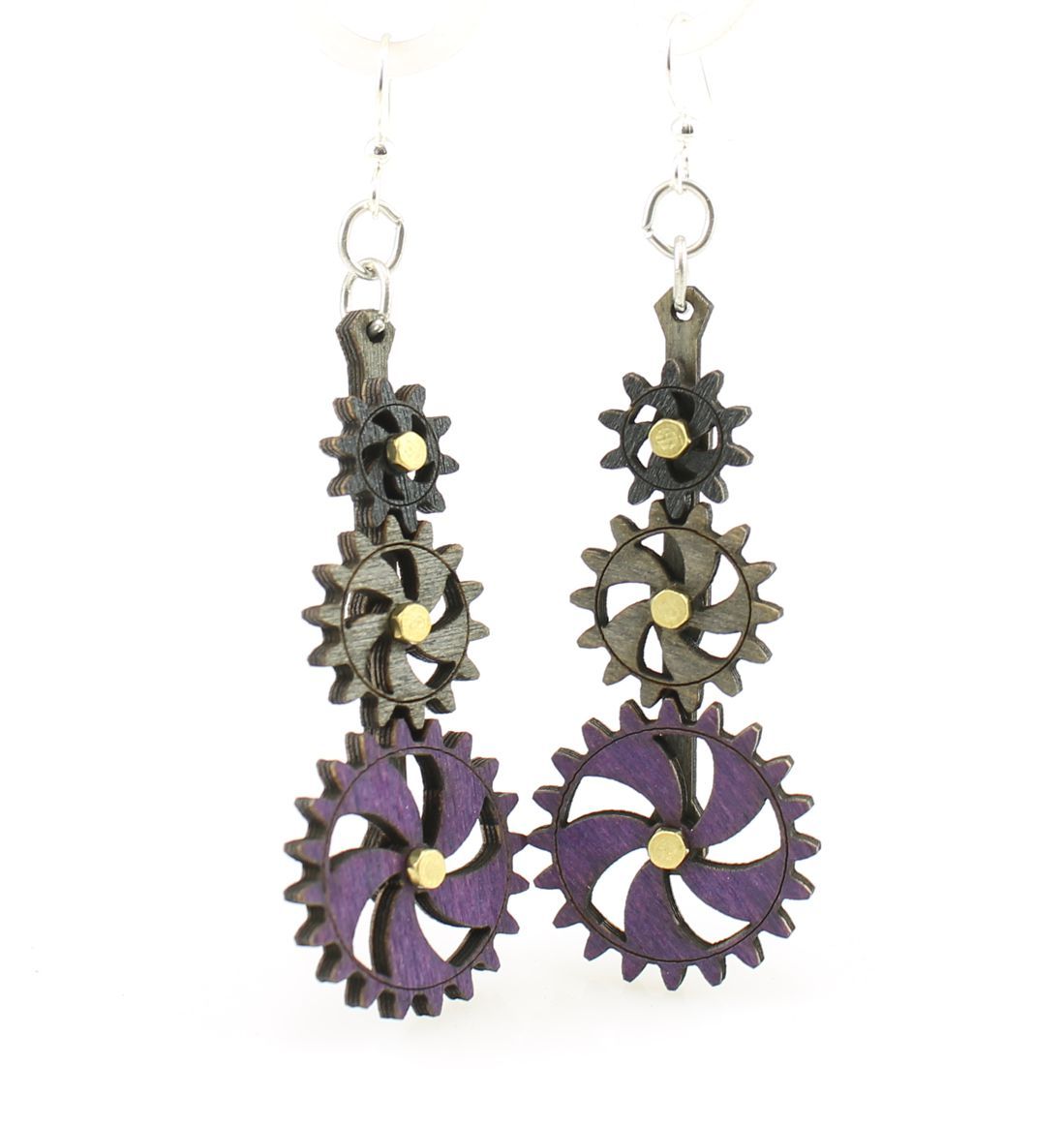 Kinetic Gear Earrings 5009E featuring moving gears, made from sustainable wood with a black satin, gray, and purple finish.