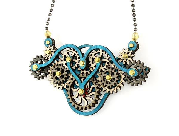 Kinetic Winged Gear Necklace 6004F featuring moving gears, made from sustainably sourced wood in Aqua Marine, Gray, Natural Wood, Tan, and Cherry Red colors.