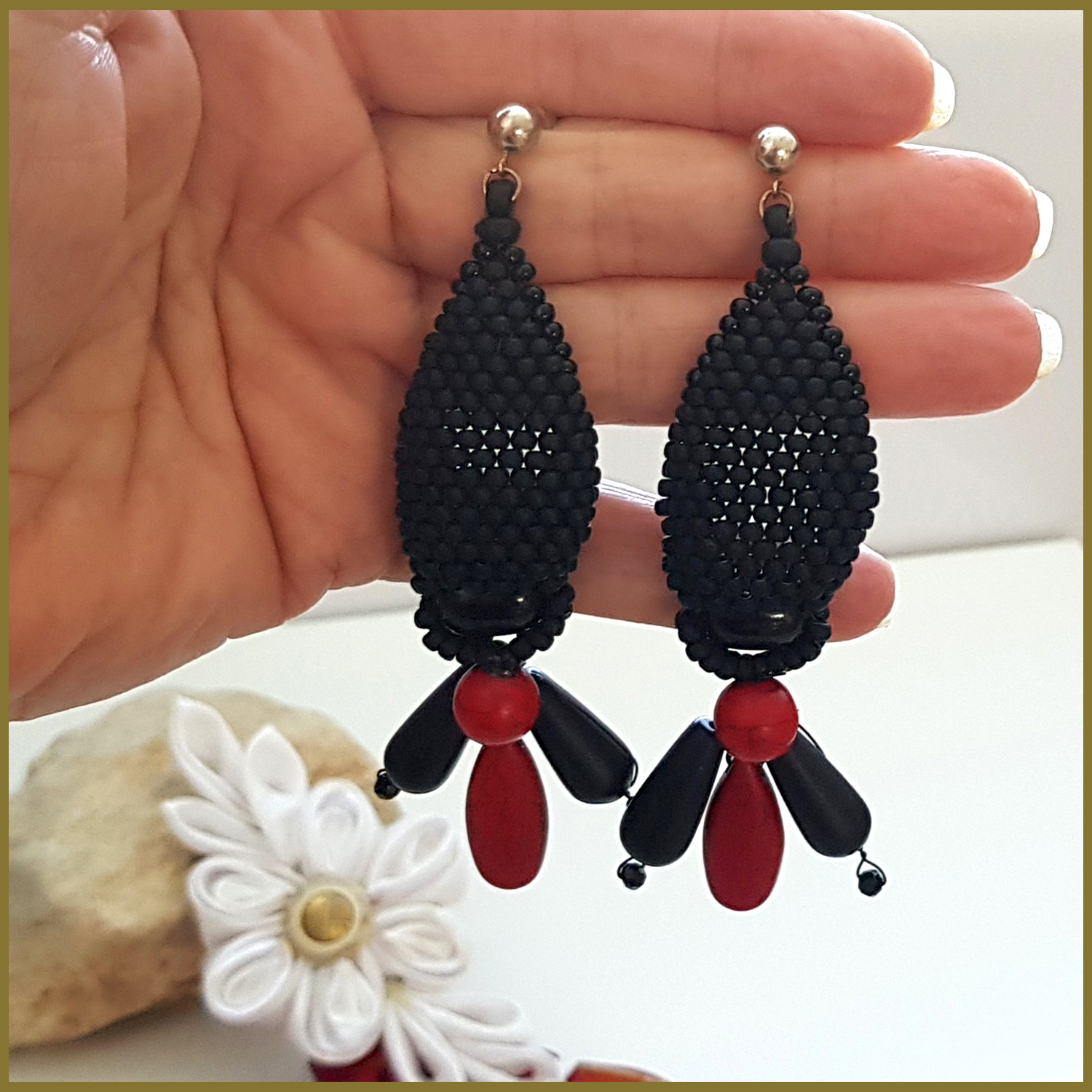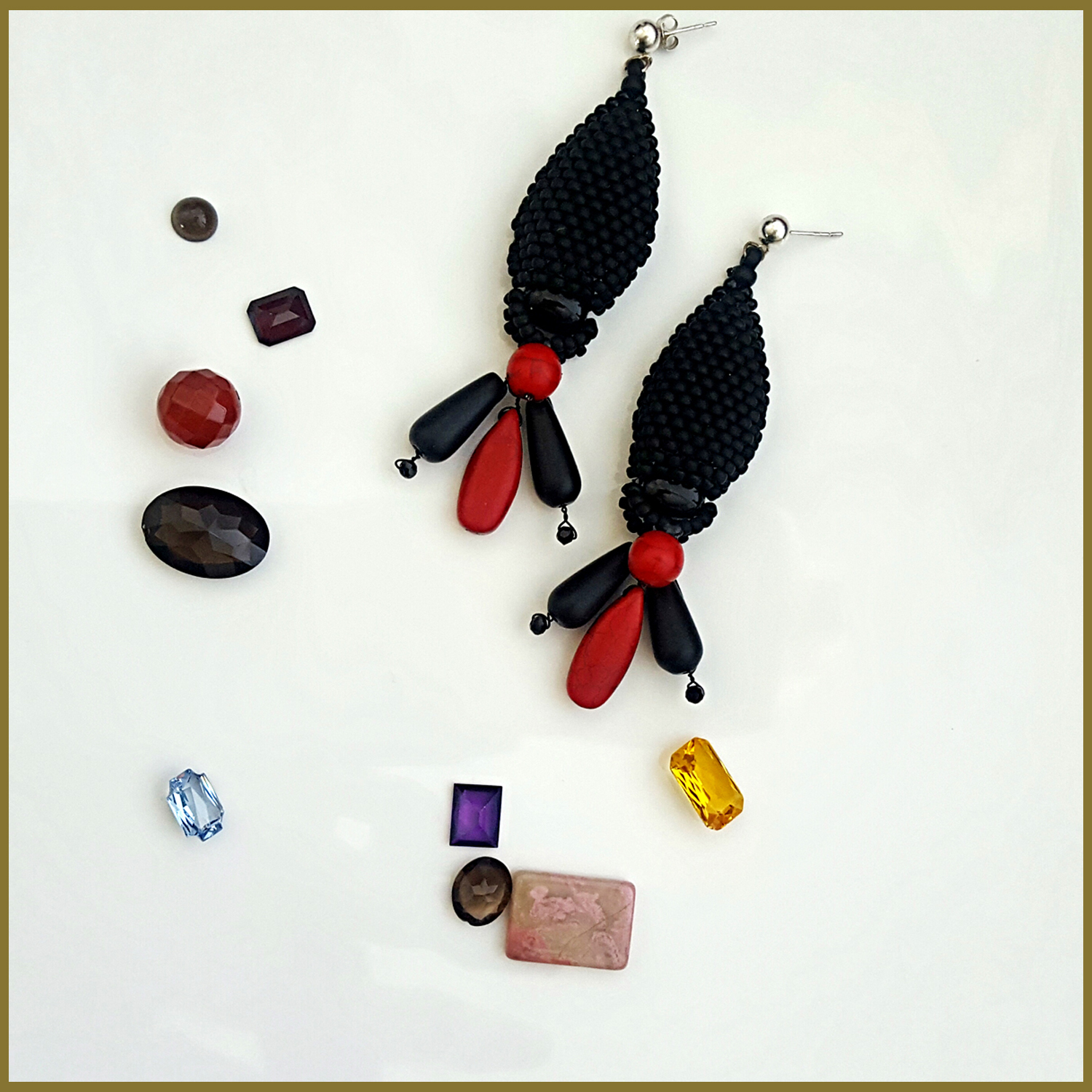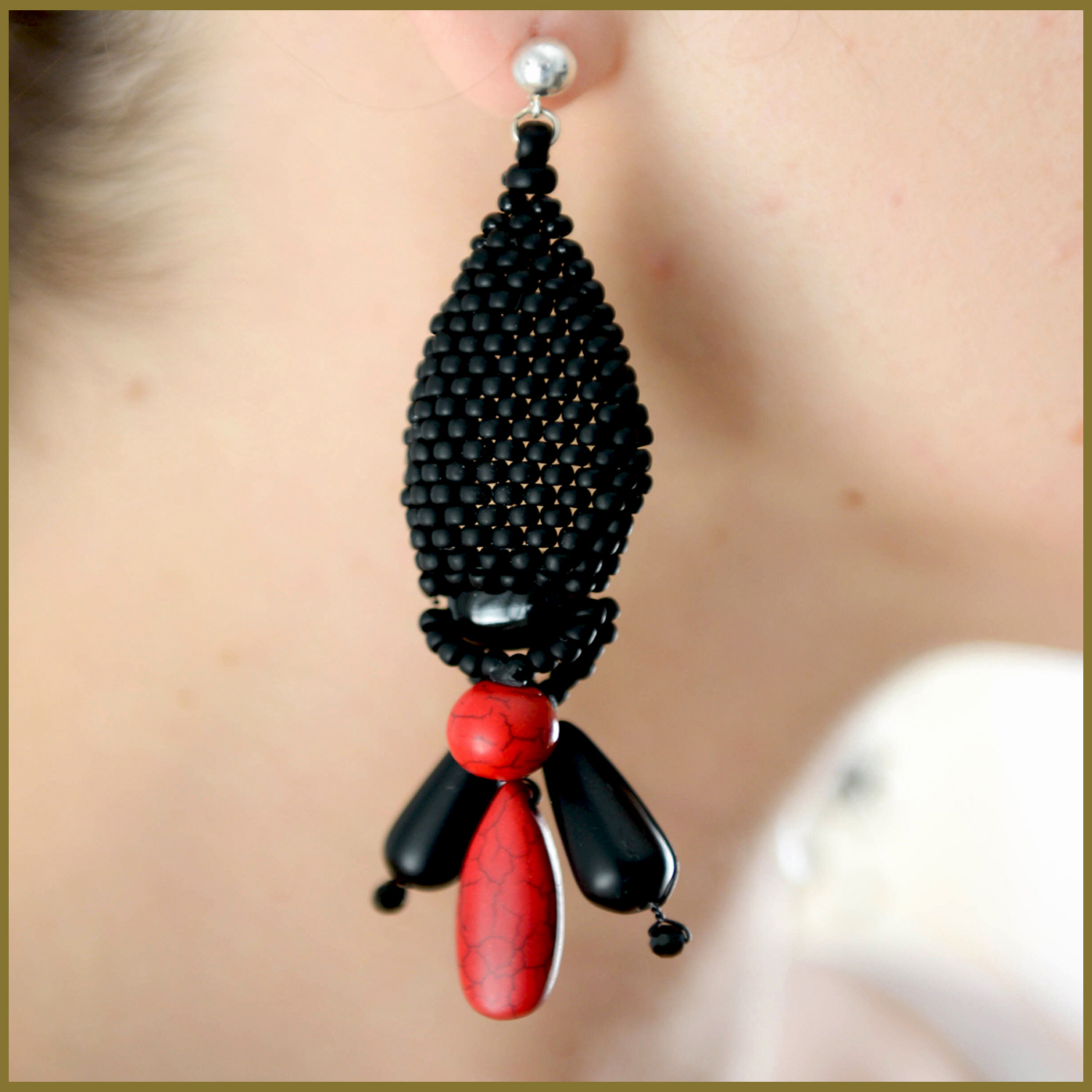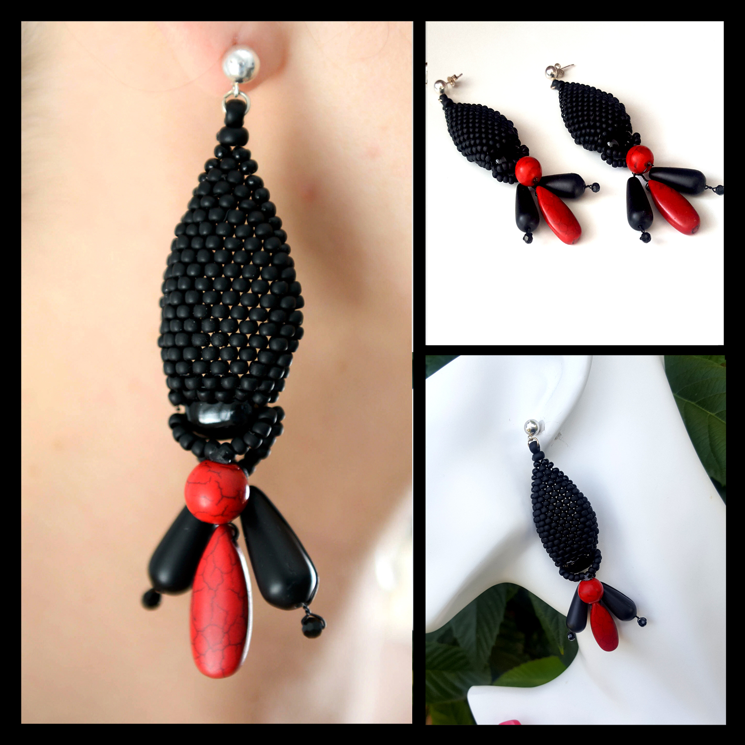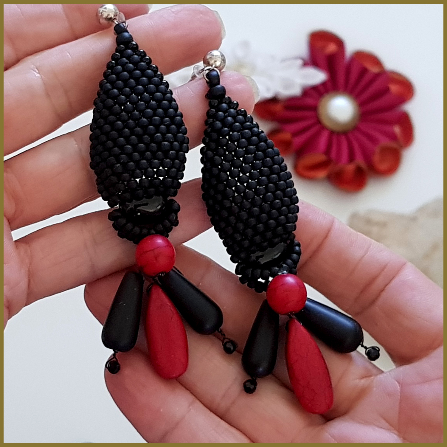 Introducing the KTC-380 Stunning Statement Earrings, a remarkable piece of jewelry that combines the elegance of Black Agate and the vibrant energy of Red Howlite. These earrings are not just accessories; they are a statement of style and individuality. Crafted with meticulous attention to detail, each pair features world-renowned Toho beads in a stunning black frost finish, enhancing the overall aesthetic of the earrings. The black Agate stones are known for their grounding properties, while the red Howlite adds a pop of color and is believed to promote calmness and emotional healing.
