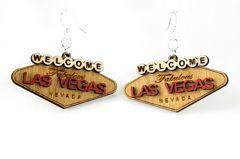 A pair of Las Vegas Sign Earrings made from laser-cut wood, featuring a vibrant design and silver-finished stainless steel ear wires.