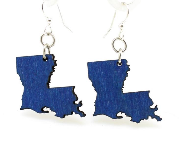 Louisiana State Earrings - S018, lightweight blue wooden earrings with intricate laser-cut design and hypoallergenic silver-finished ear wires.