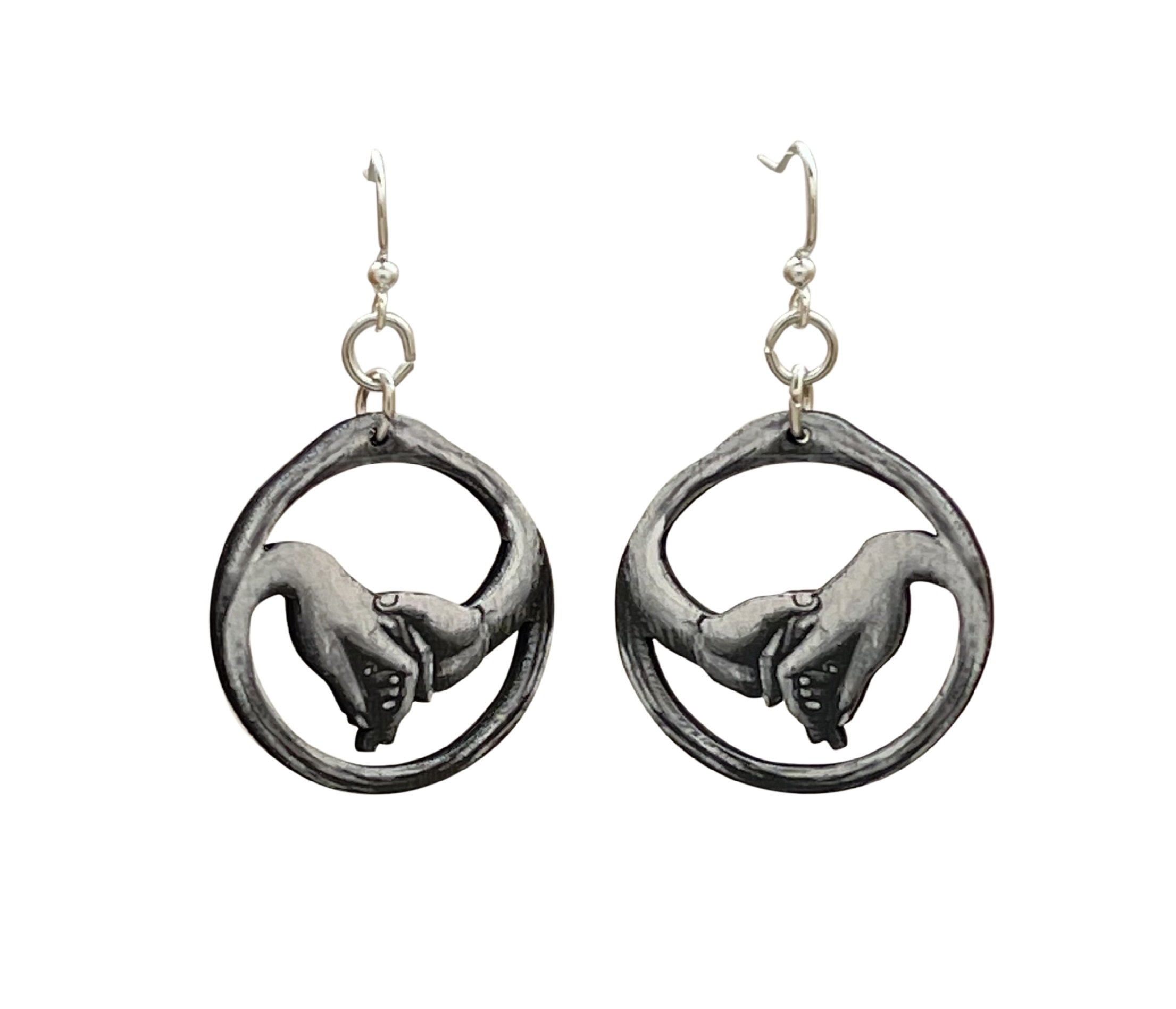 A pair of Loving Hands Earrings made from sustainably sourced wood with silver-finished stainless steel ear wires, showcasing a unique design.