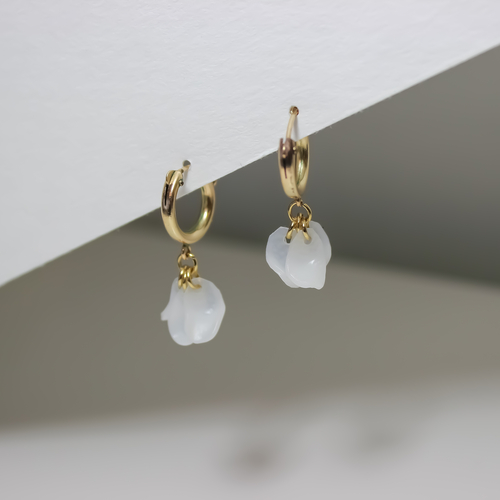 Sustainable 14k gold filled huggers with white flower pendant. Handmade with recycled metals and upcycled bottles in Arlington, VA. Perfect lightweight and durable everyday earring. Dimensions are 0.5x1 inches.