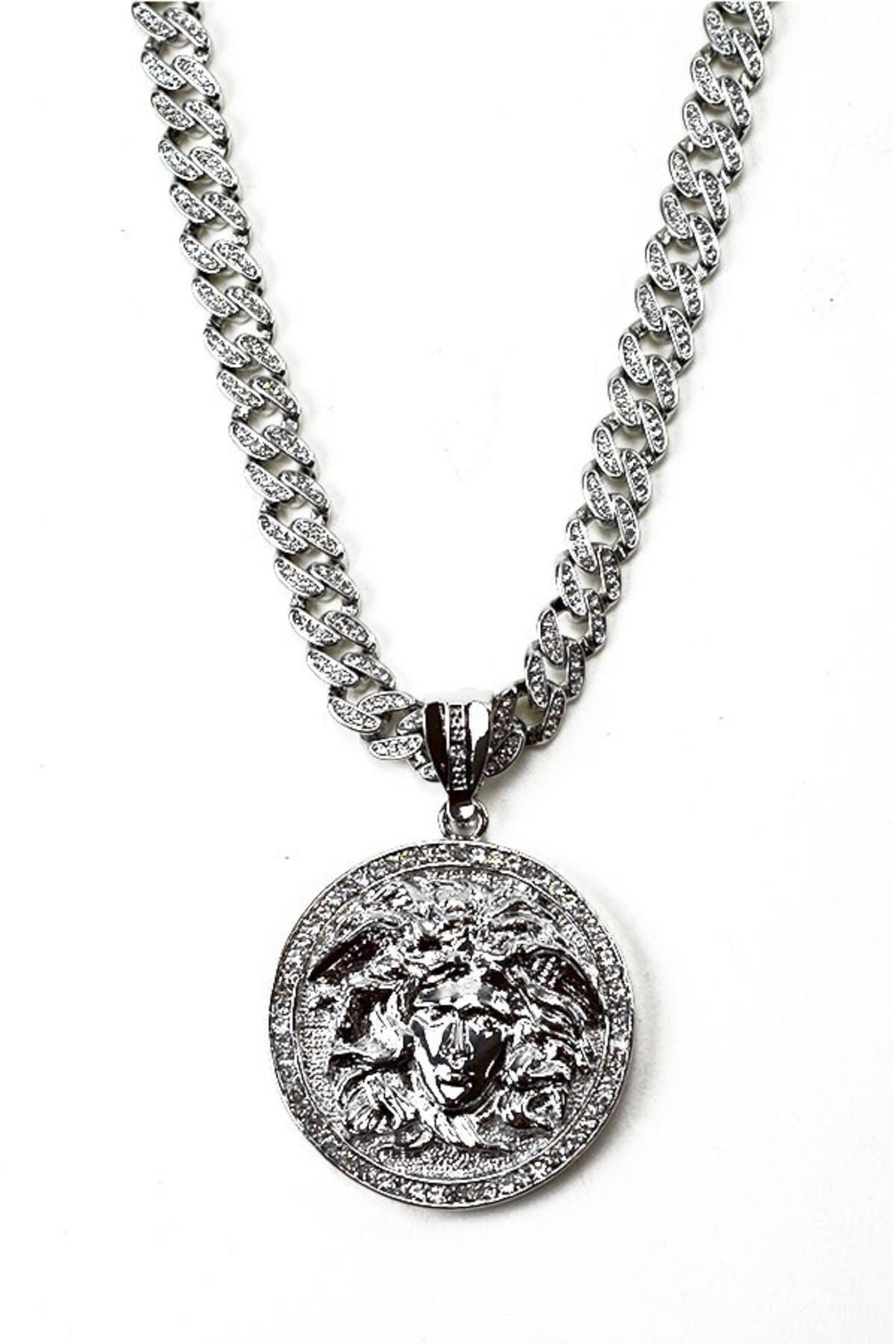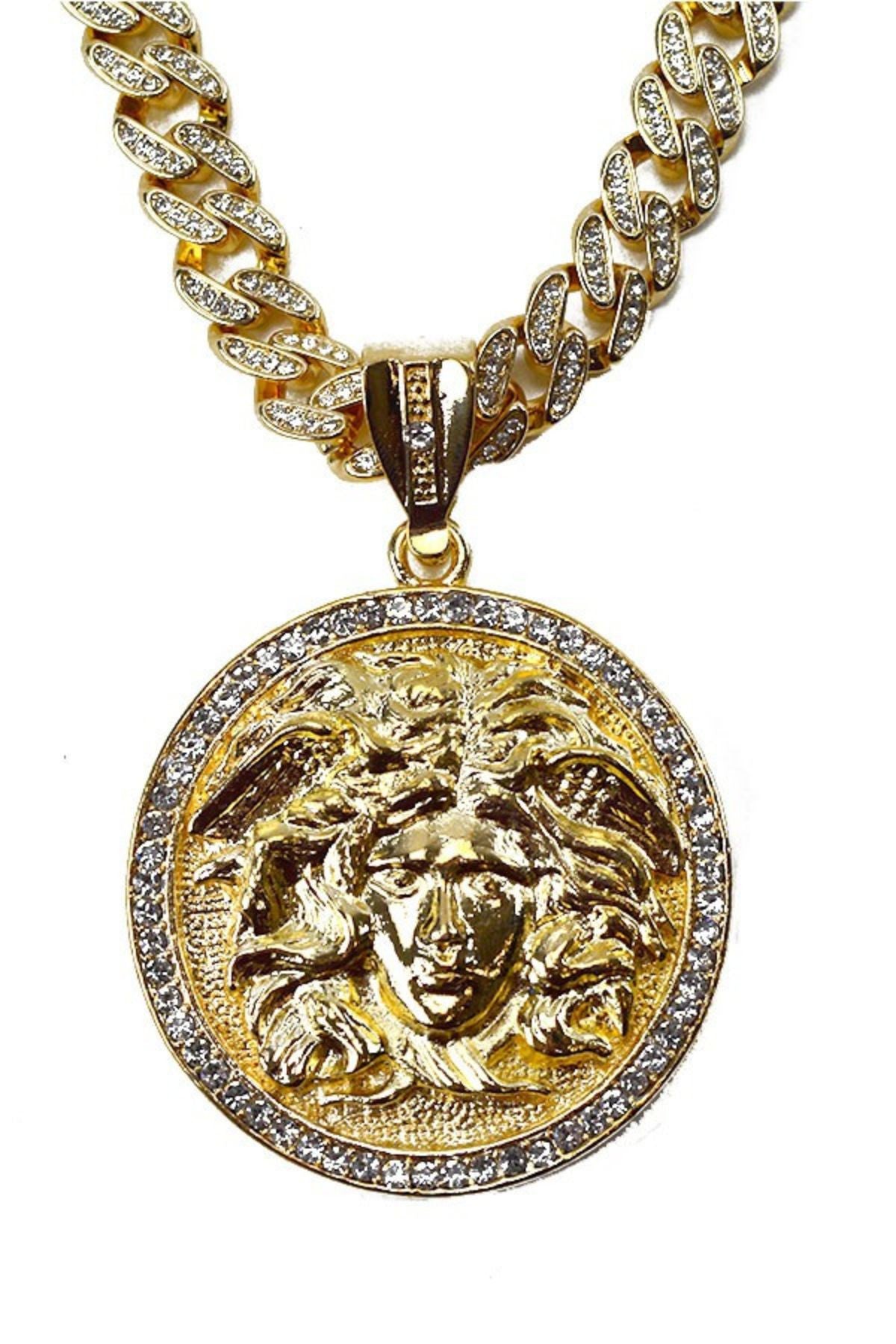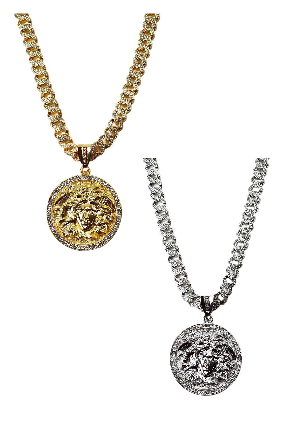 The Medusa Pendant Cuban Chain Necklace is a striking piece of jewelry that combines elegance and boldness. With its unique Medusa pendant, this necklace is designed to make a statement. The pendant measures approximately 2.5 inches by 2.5 inches, making it a noticeable accessory that can elevate any outfit.