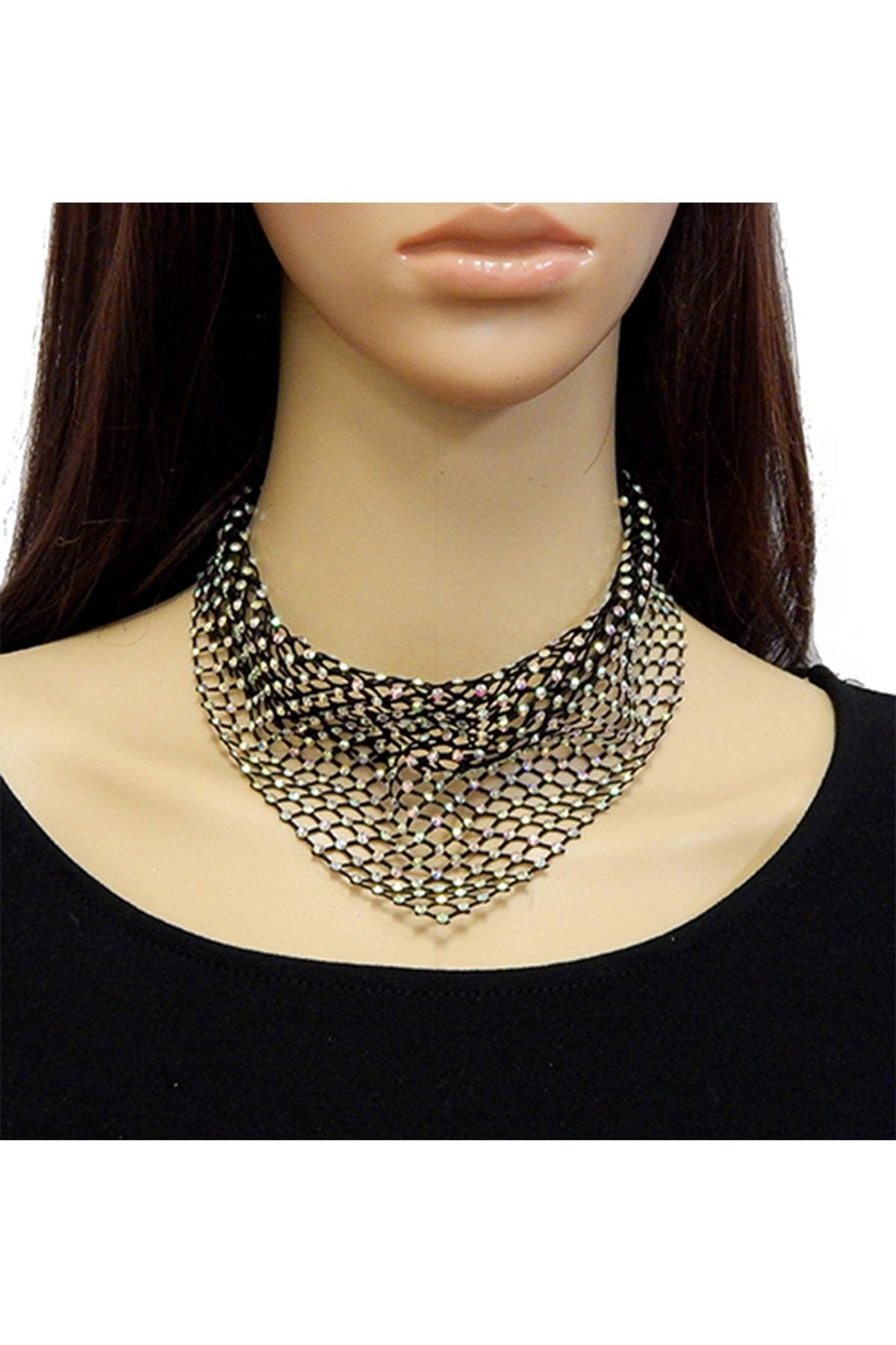 A beautiful Mesh Rhinestone Bib Necklace featuring a mesh design with sparkling rhinestones, secured with a lobster claw clasp.