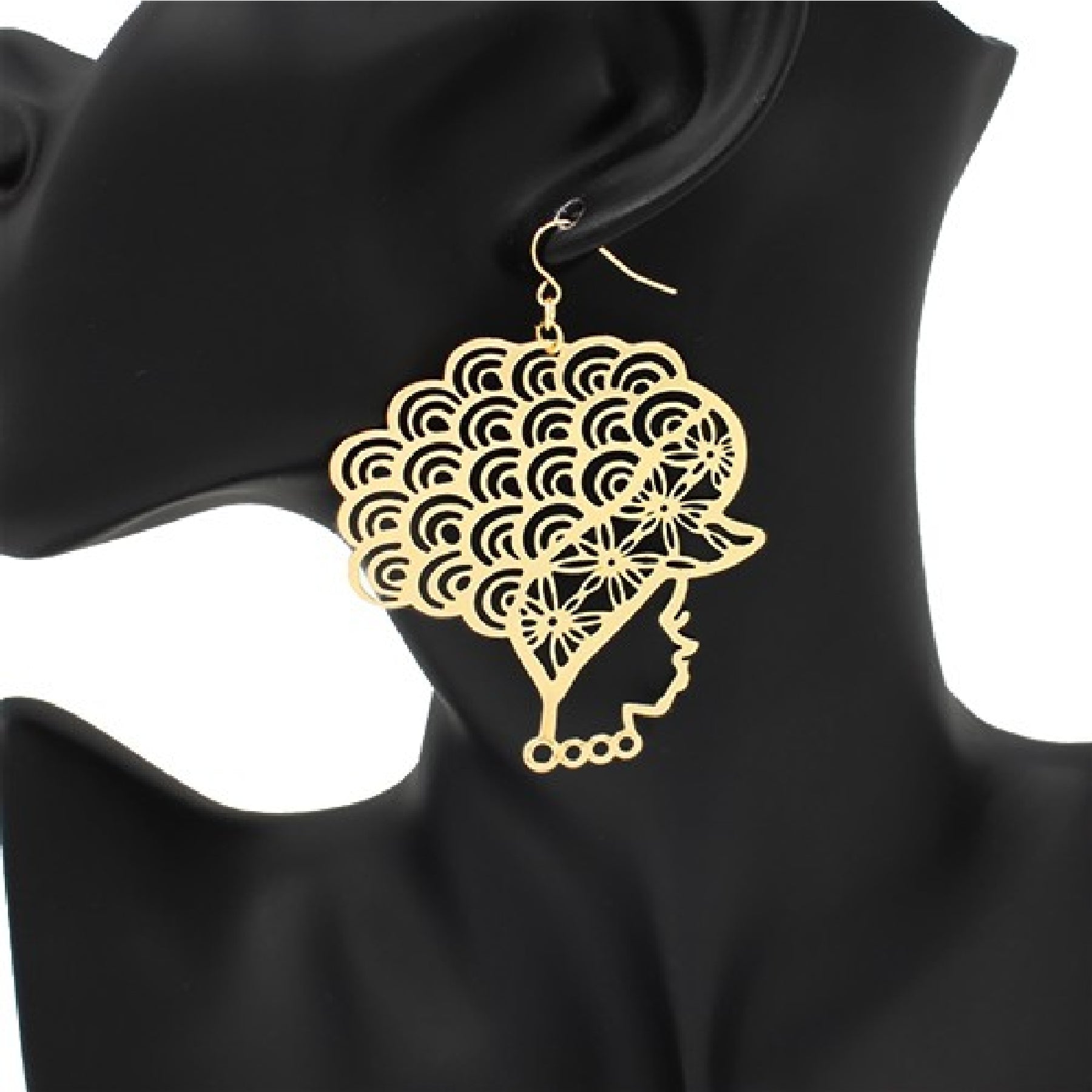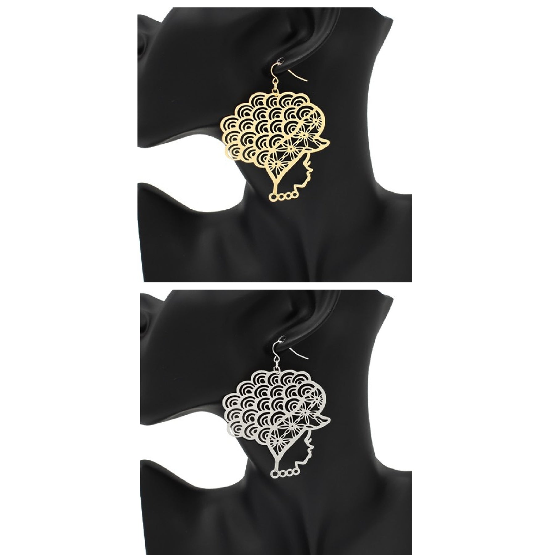 Stylish Metal Afro Lady Earrings with fish hook design, showcasing a unique afro lady silhouette.