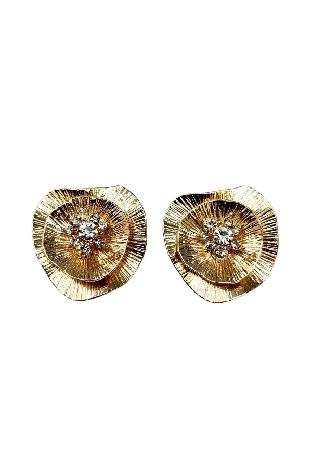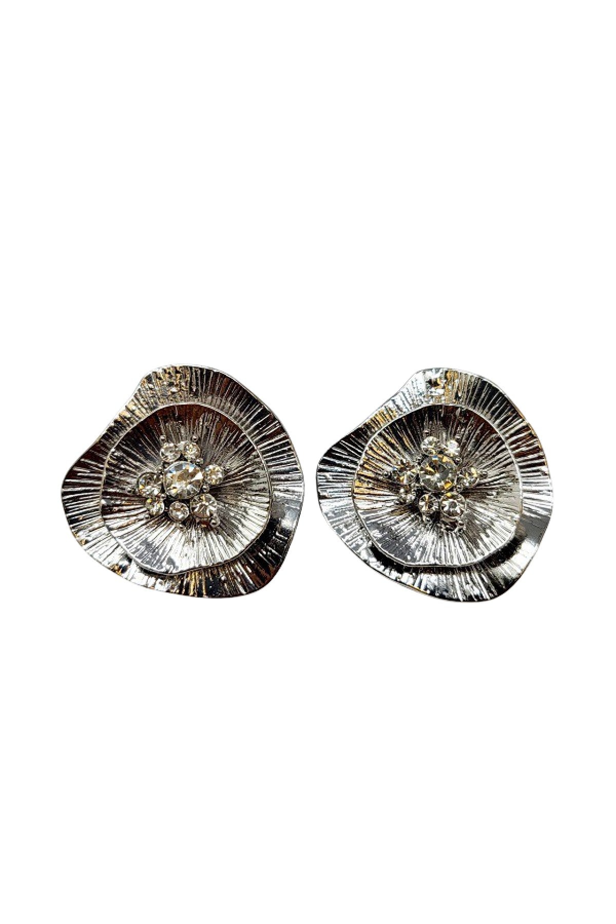 Elegant metal flower clip-on earrings adorned with sparkling stones, showcasing a beautiful floral design.