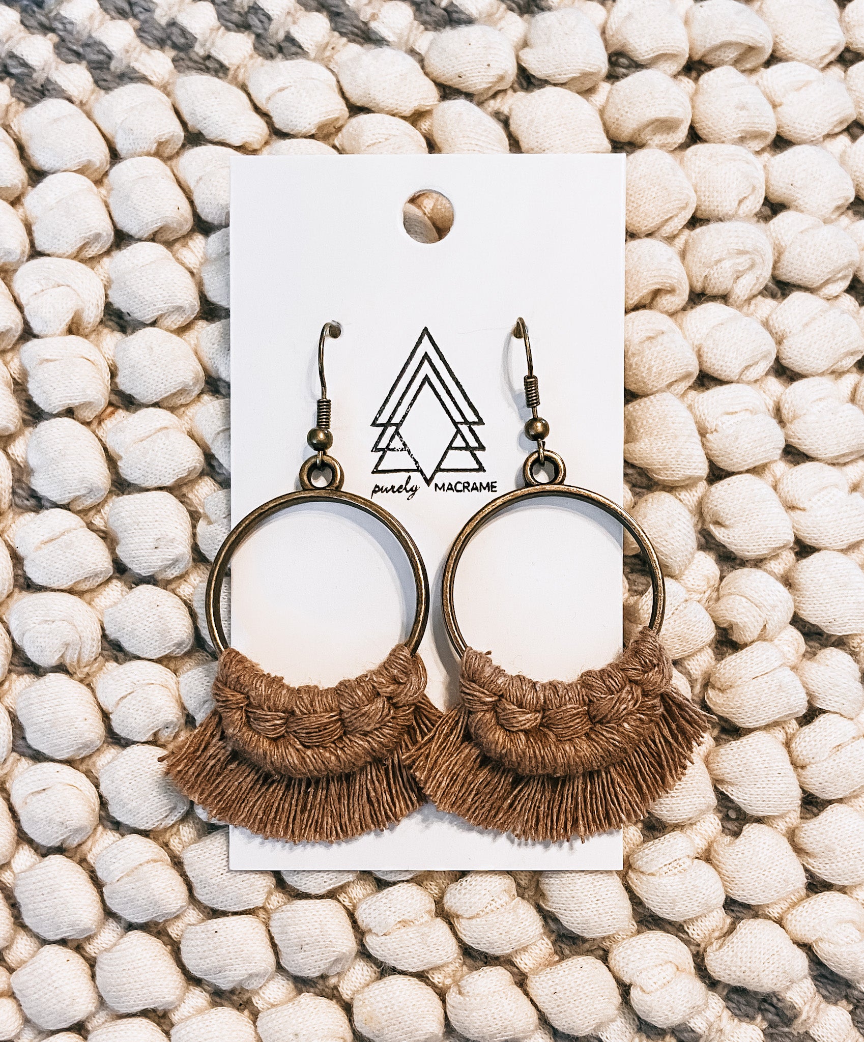 Elegant Mocha Round Earrings made from 100% macrame cotton, featuring a lightweight and hypoallergenic design.