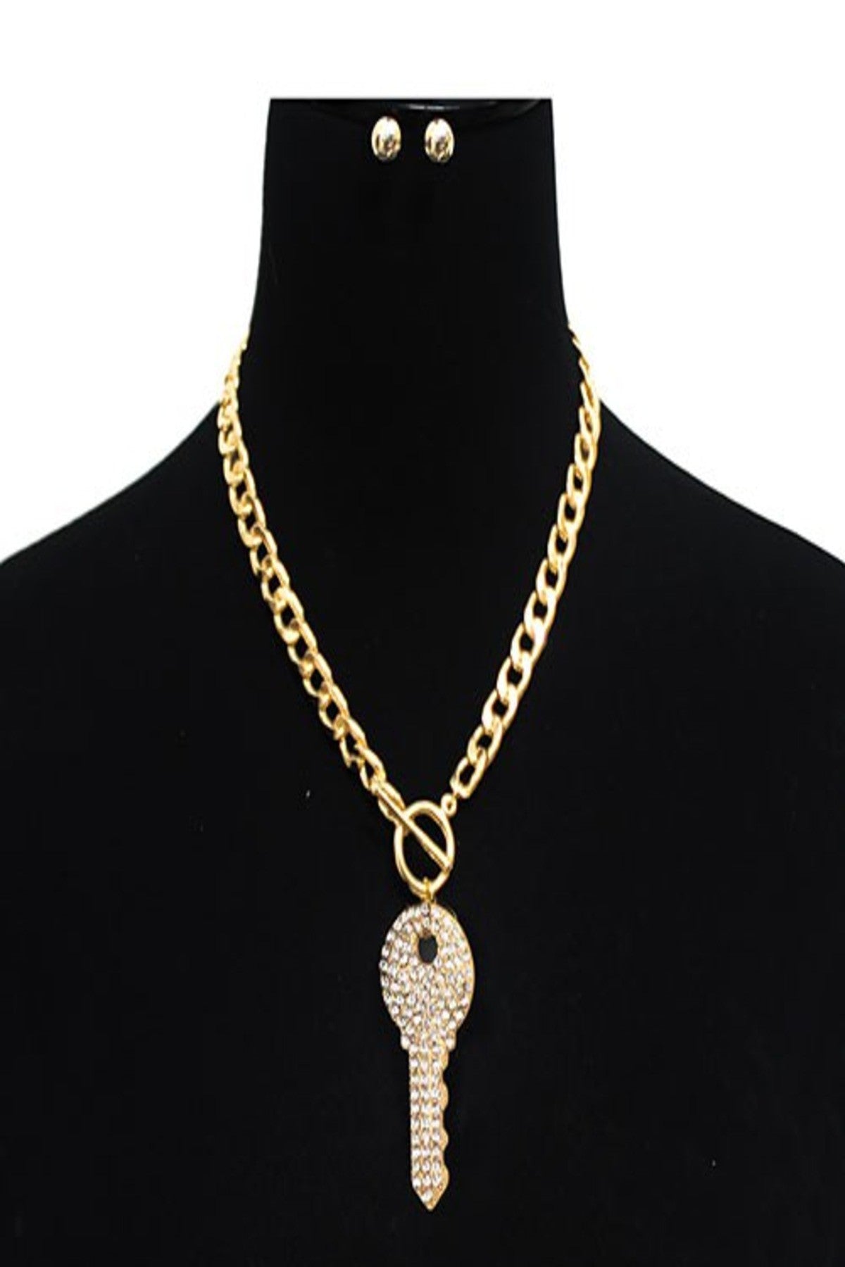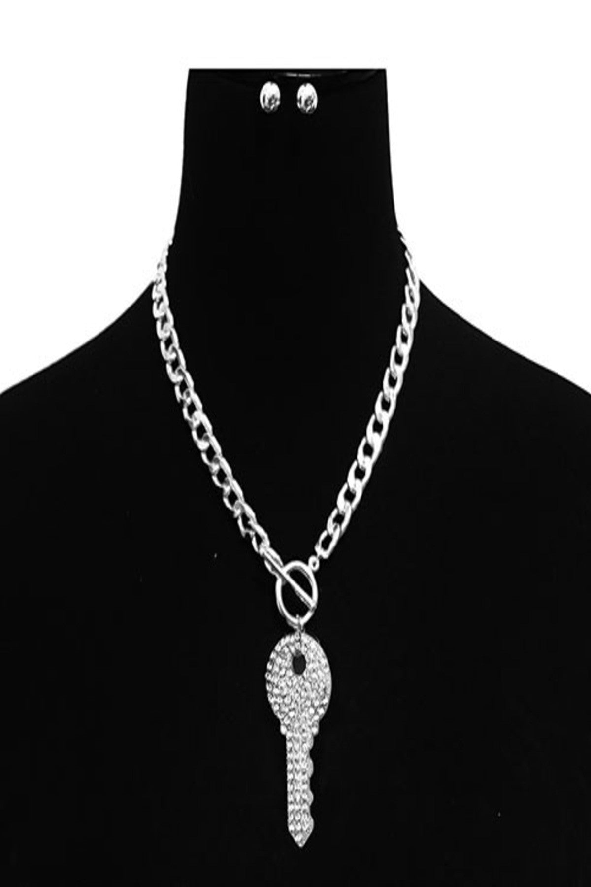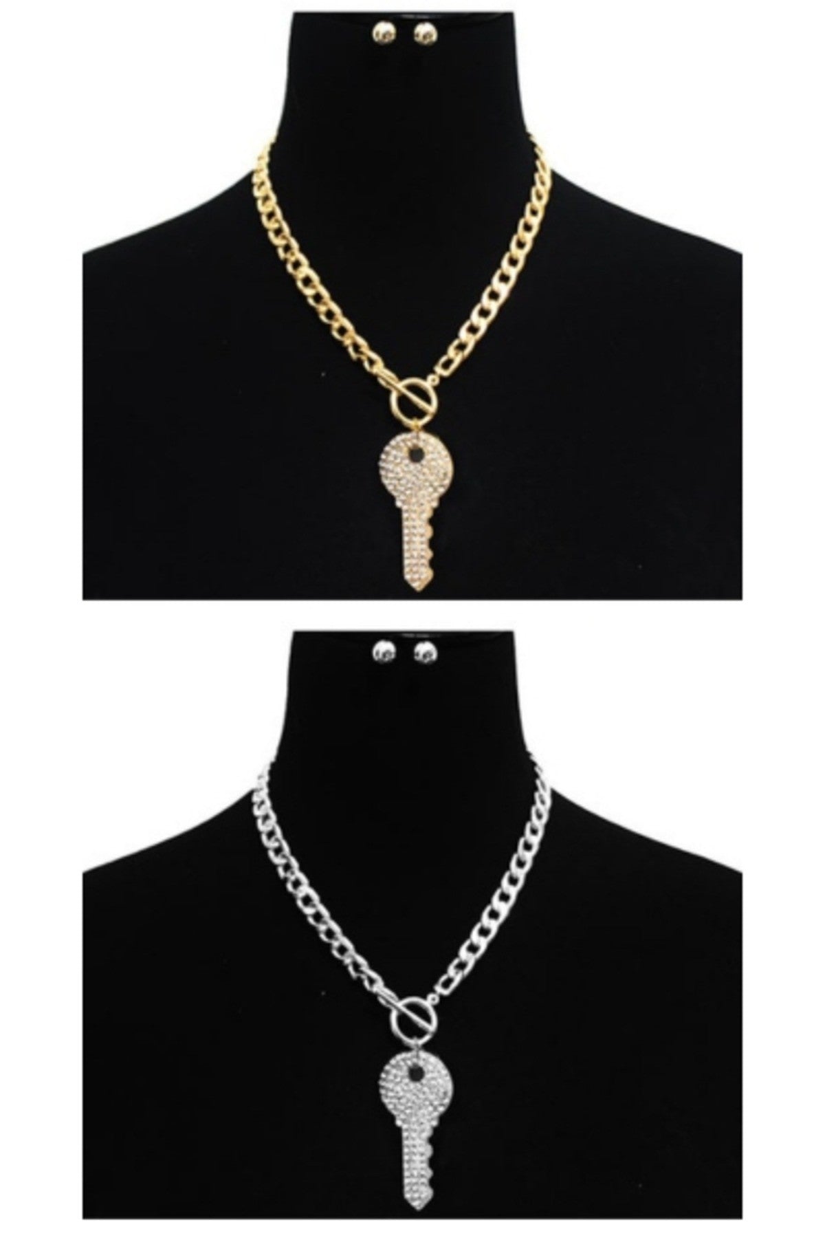 The Necklace Set Key Crystal Toggle is a versatile accessory that can be paired with a variety of outfits. Whether you're wearing a simple blouse, a chic dress, or even a casual t-shirt, this necklace adds a touch of elegance and charm. It's perfect for layering with other necklaces or wearing alone as a statement piece.